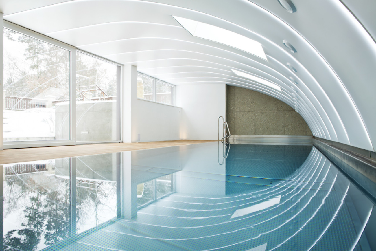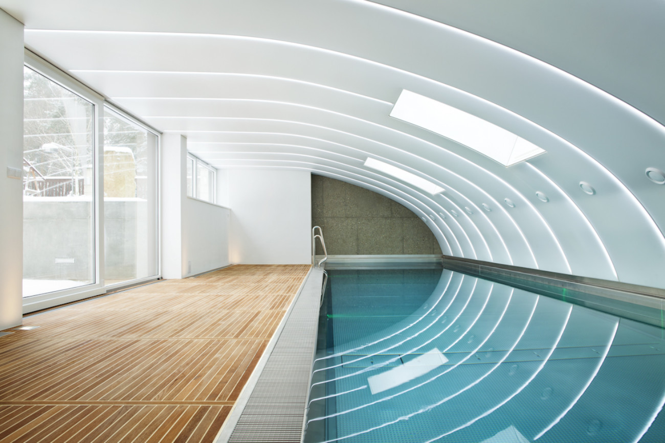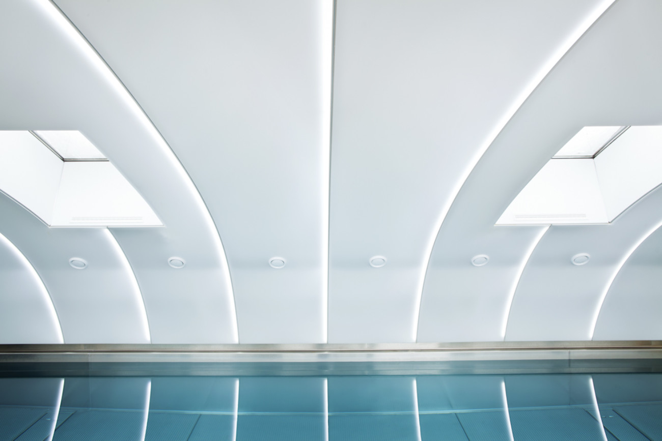 Tvarovaný podhled, translucentní fólie v pruzích, liniově nasvícená, Klánovice