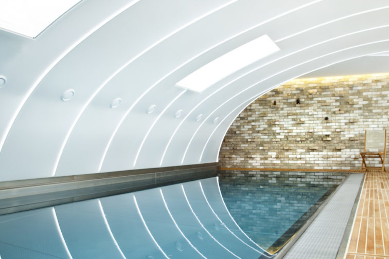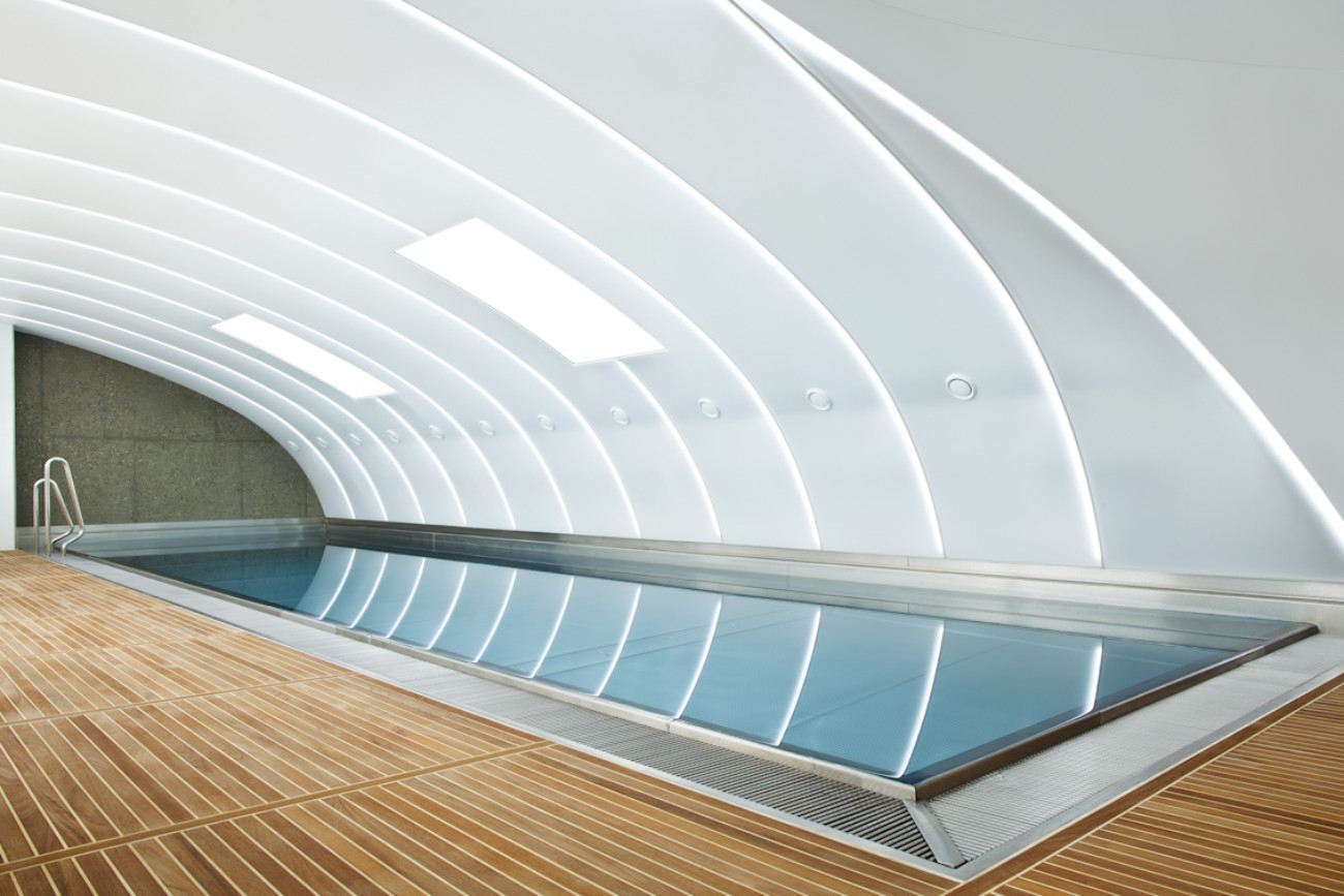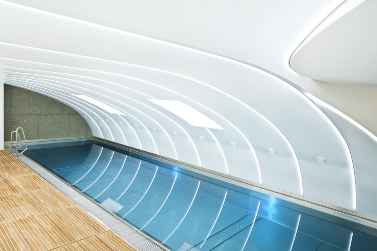 Tvarovaný podhled, translucentní fólie v pruzích, liniově nasvícená, Klánovice