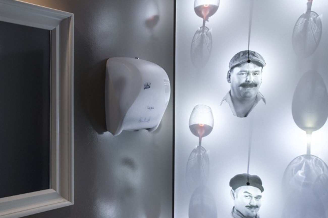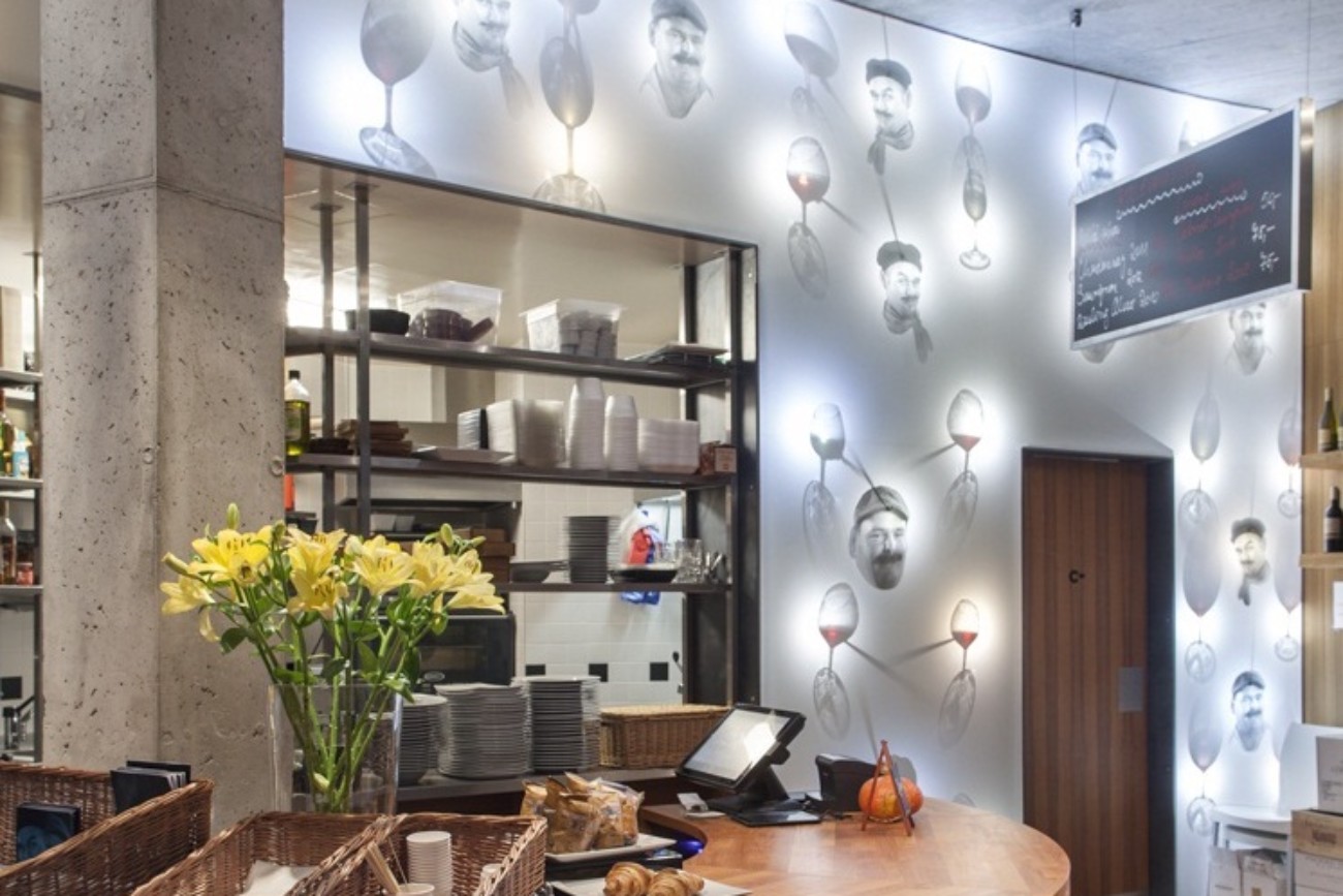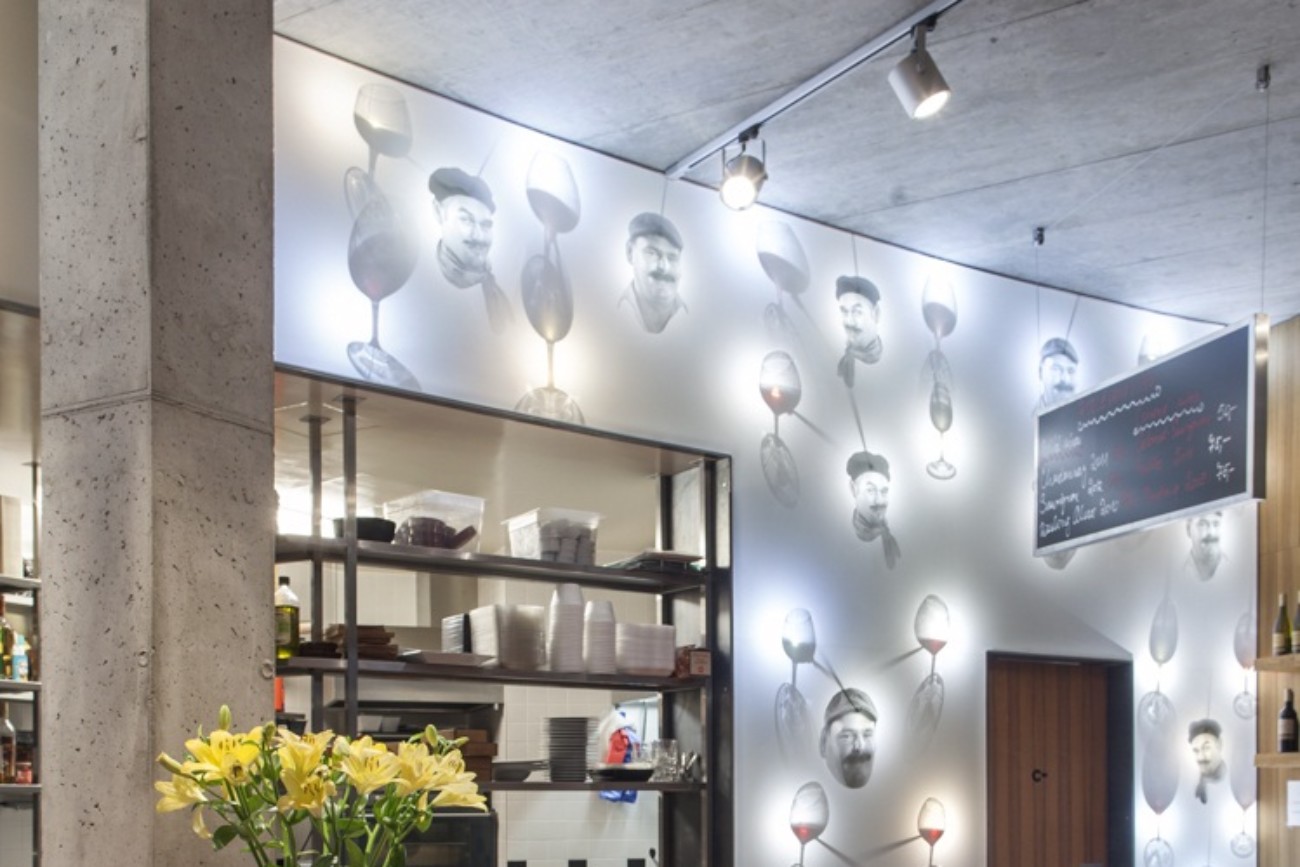 Realizace dekorativní předstěny technologií podsvícení objektů umístěných za fólií BARRISOL, Praha