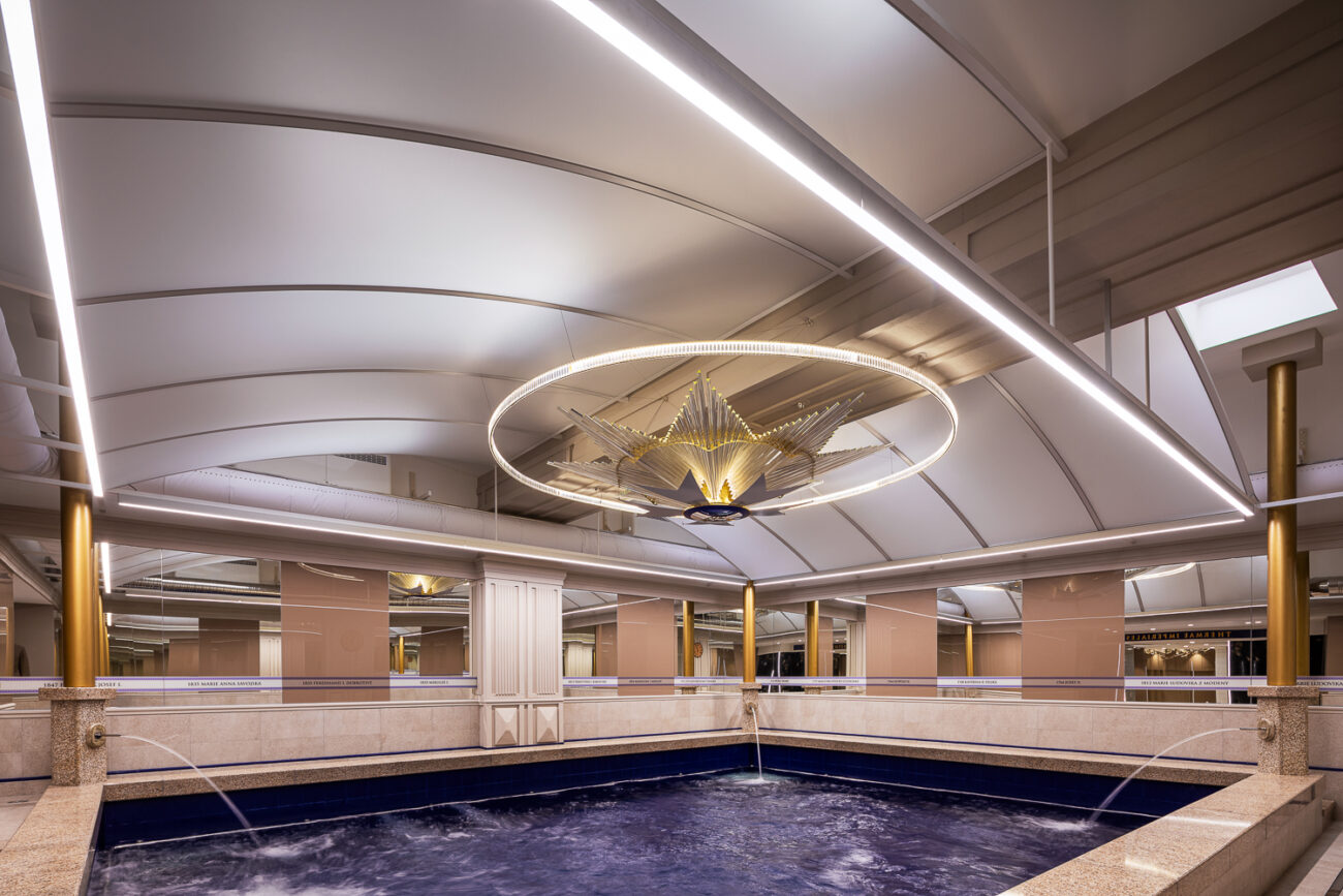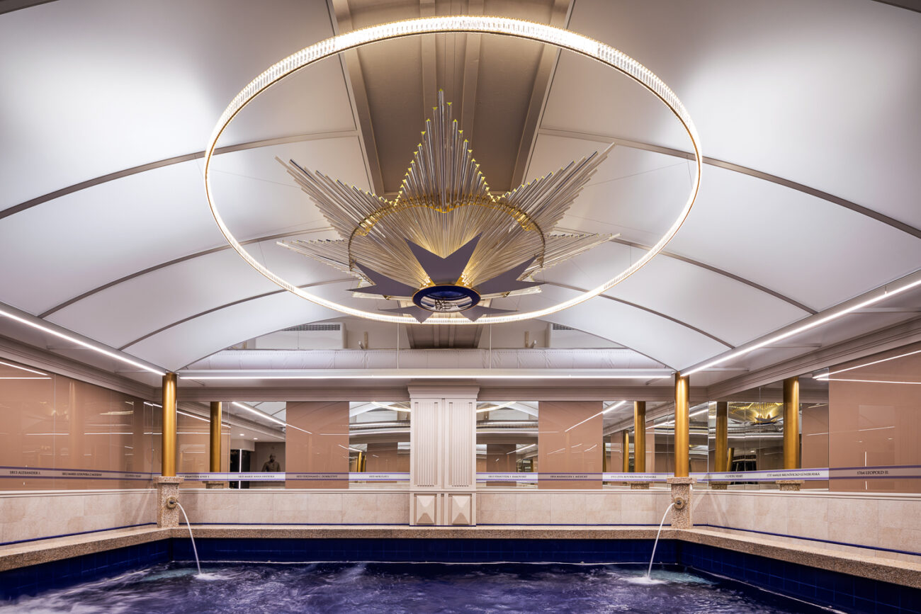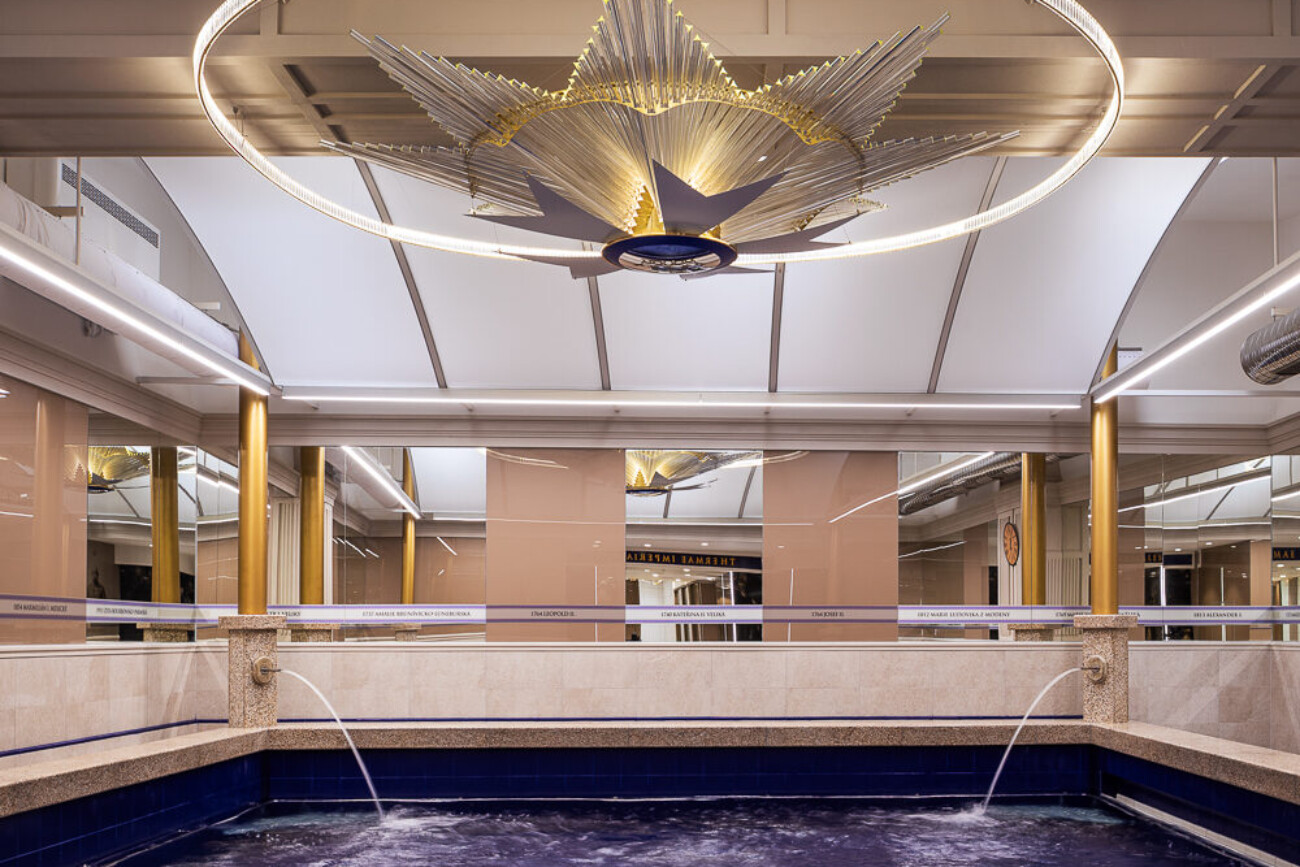 V projektu Císařských lázní v Teplicích jsme podle návrhu architekta Petra Sedláčka vytvořili klenbu nad bazénem. Hliníkovou konstrukci vyrobila naše sesterská společnost Cubis Metal. Konstrukce byla vyplněna translucentní fólií Barrisol propouštějící až 70 % denního světla. Cílem bylo designové zakrytí světlíků na stropě a vytvoření příjemného prostředí pro relaxaci. Fólie Barrisol jsou ideální při použití ve vlhkém prostředí díky svým jedinečným vlastnostem.