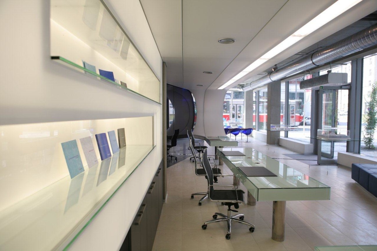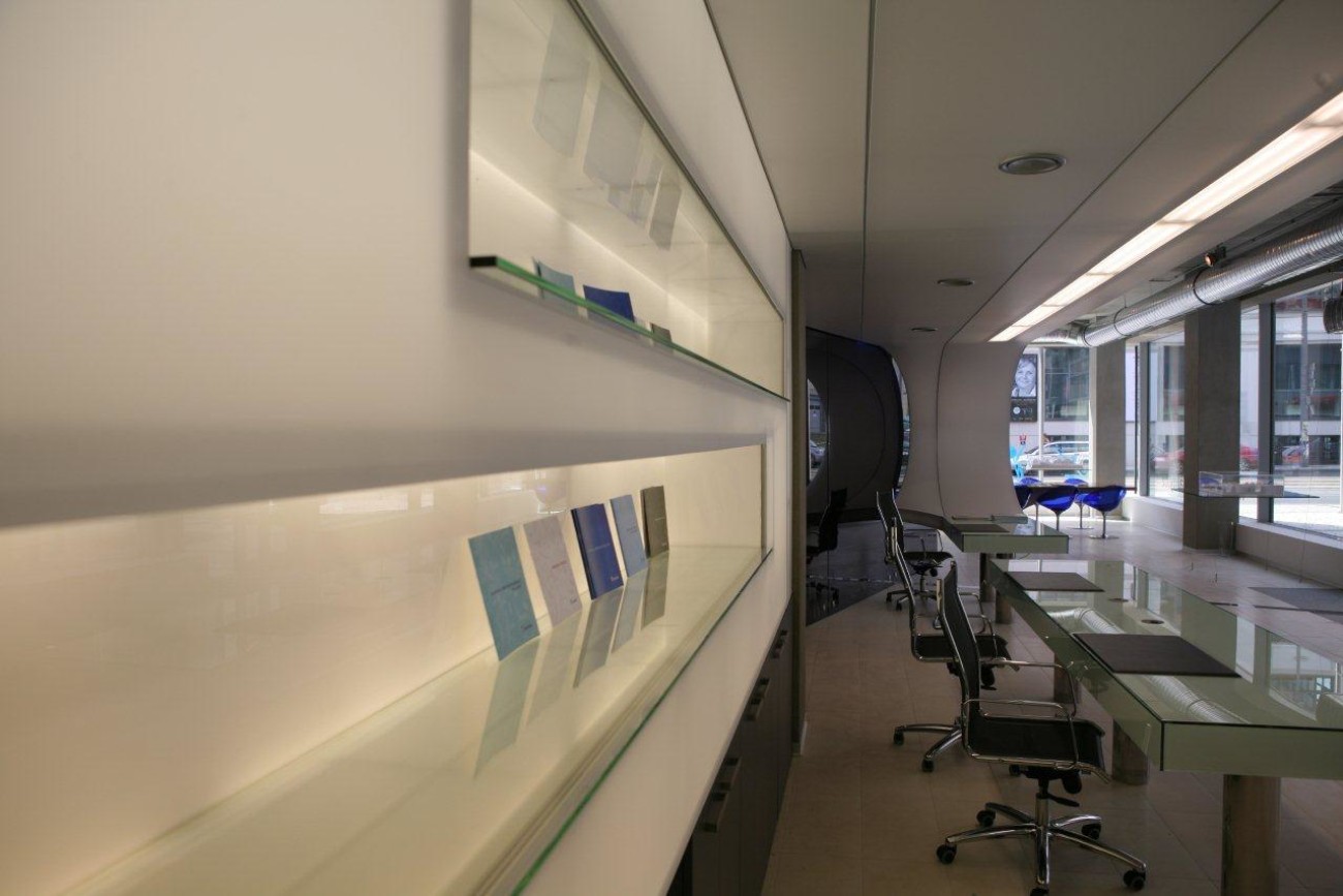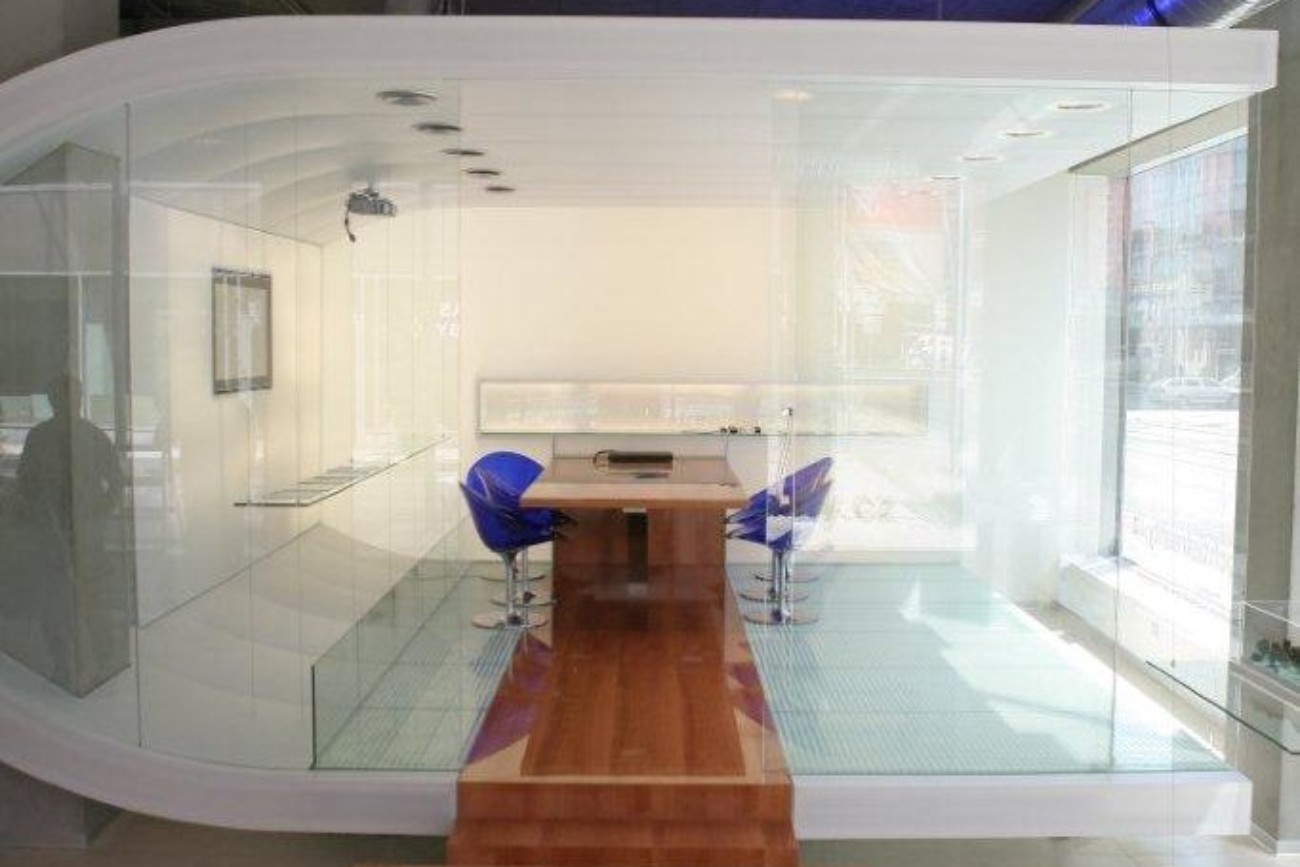 Zasedací místnost a jednací část v klientském centru Hochtief. Zámečnické práce včetně průsvitných fólií a LED svícení, Praha Anděl