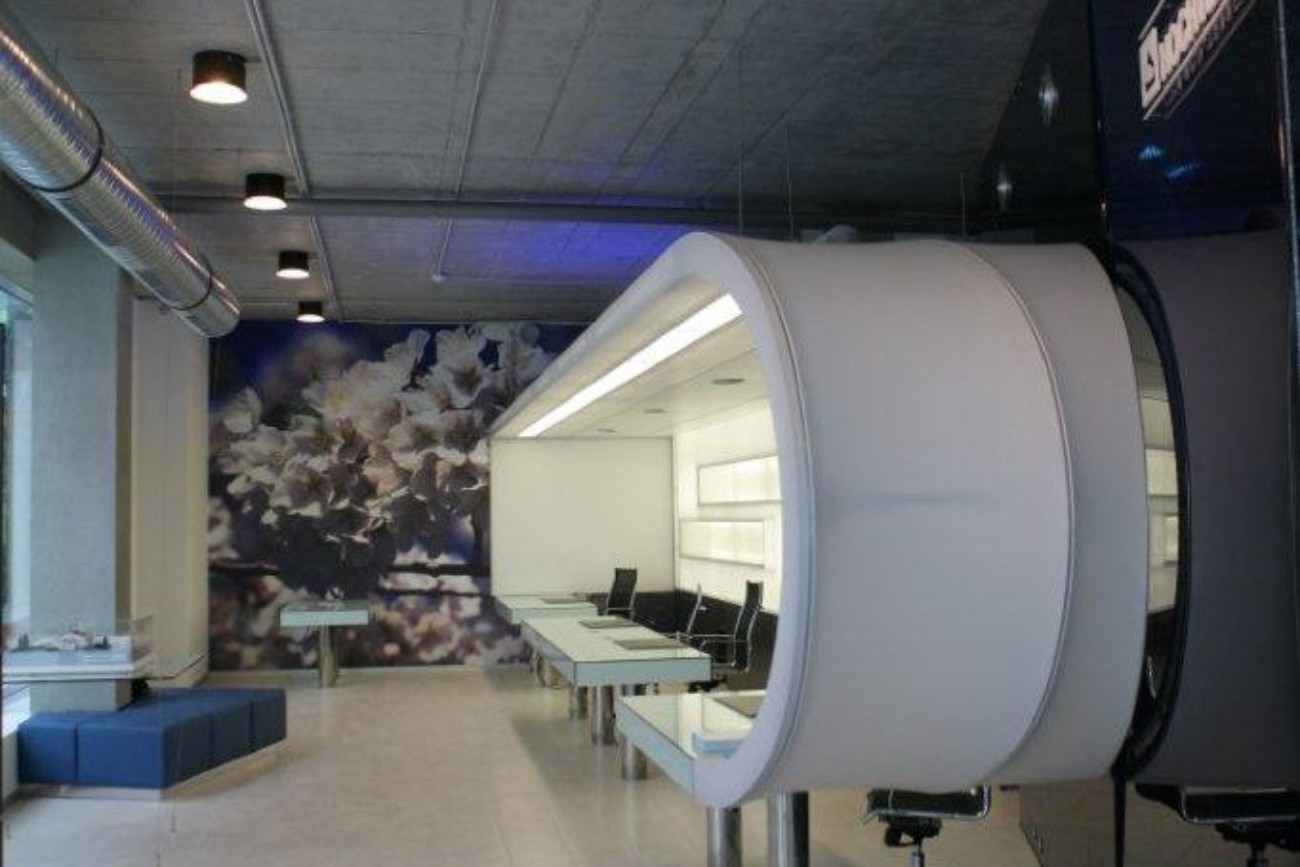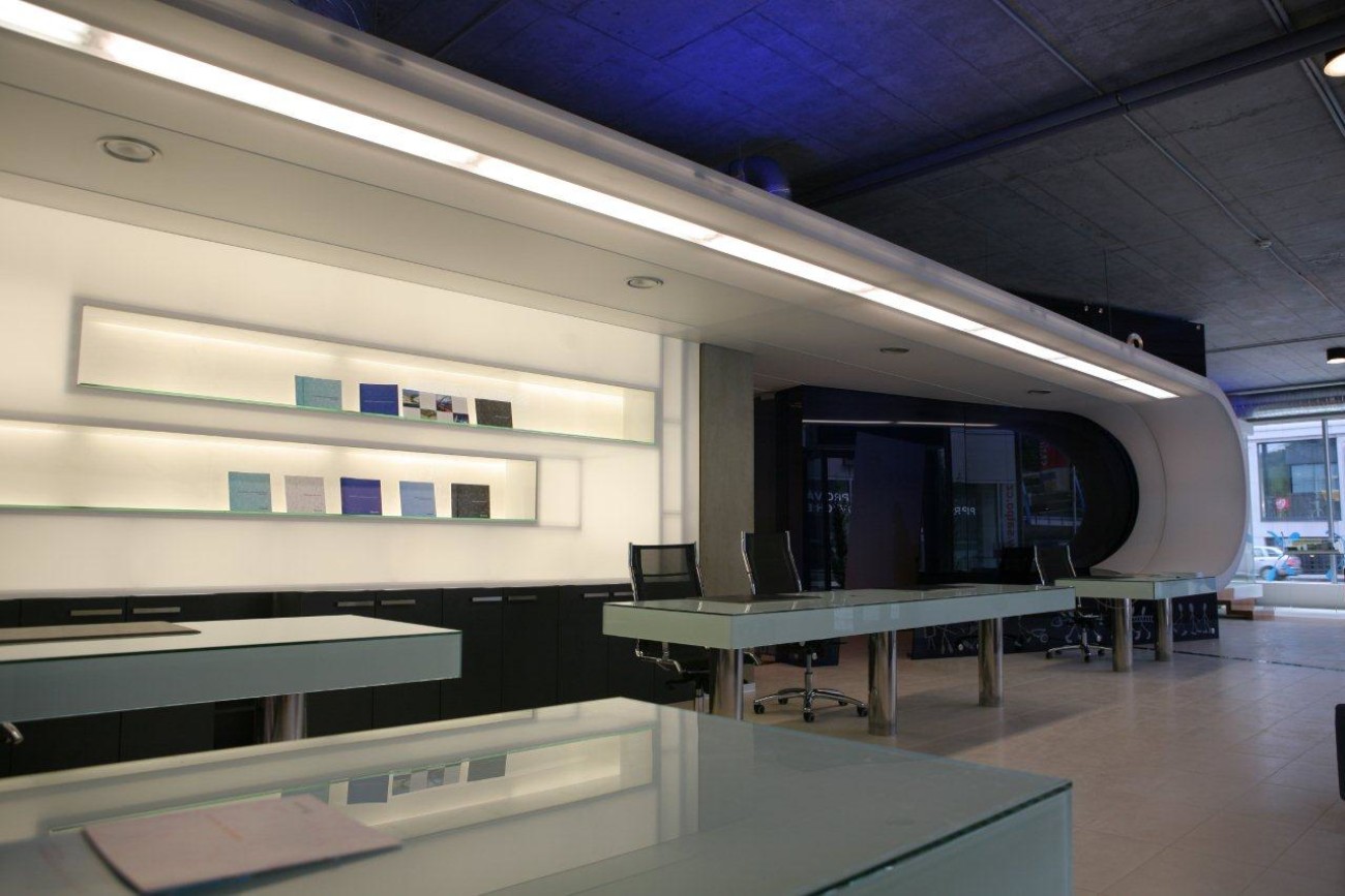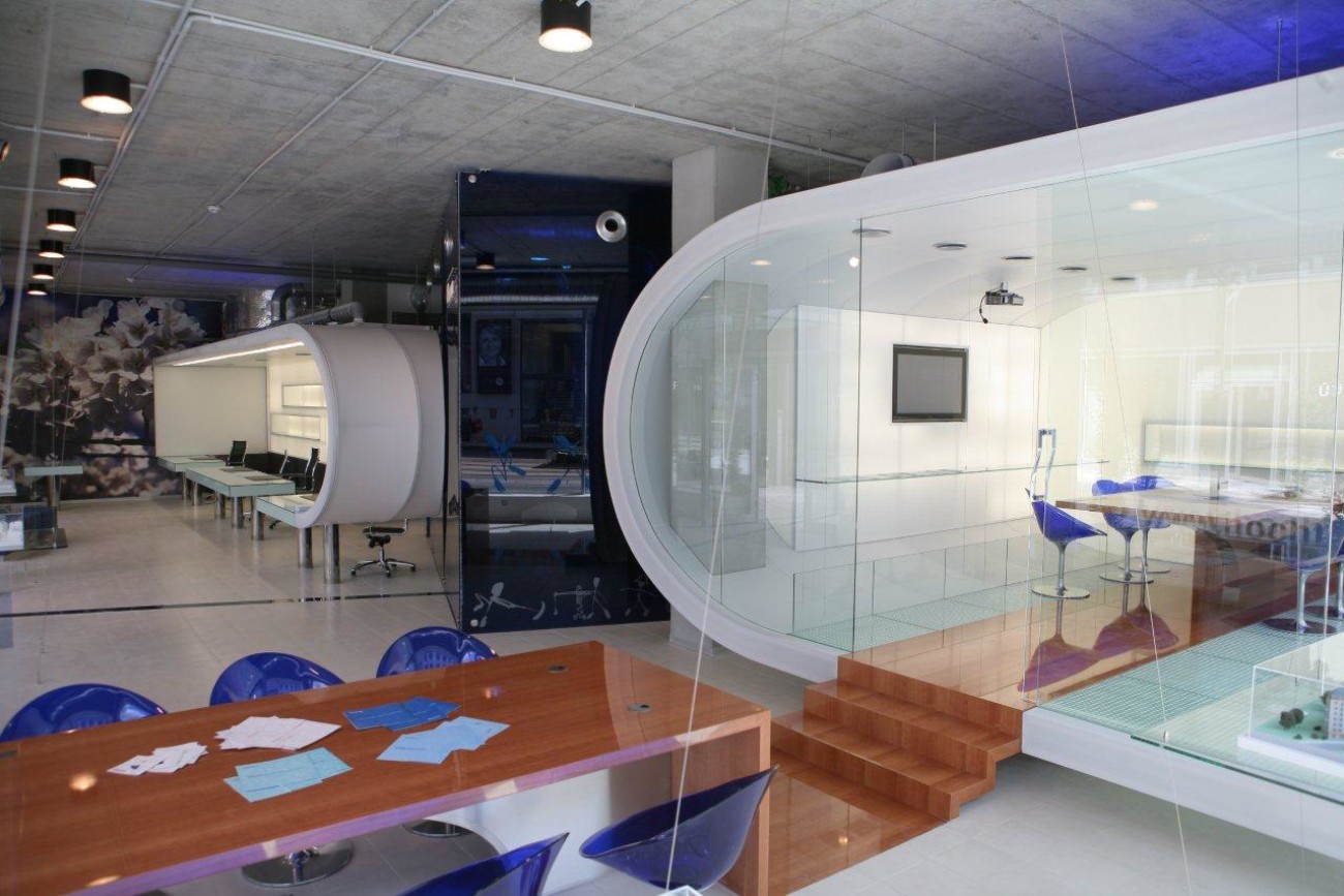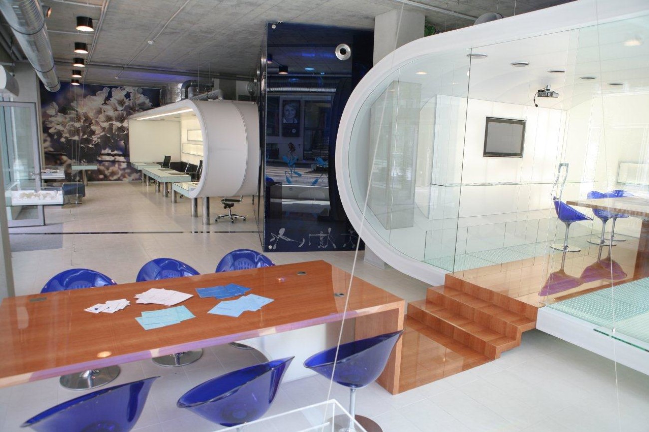 Zasedací místnost a jednací část v klientském centru Hochtief. Zámečnické práce včetně průsvitných fólií a LED svícení, Praha Anděl