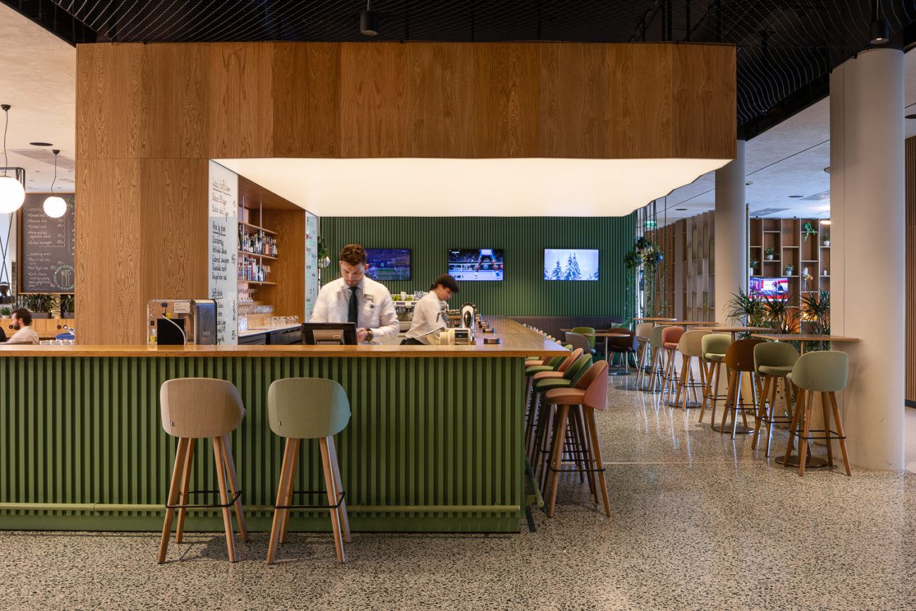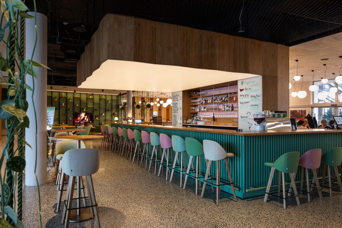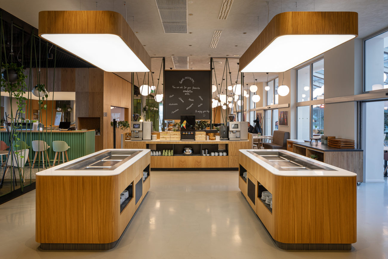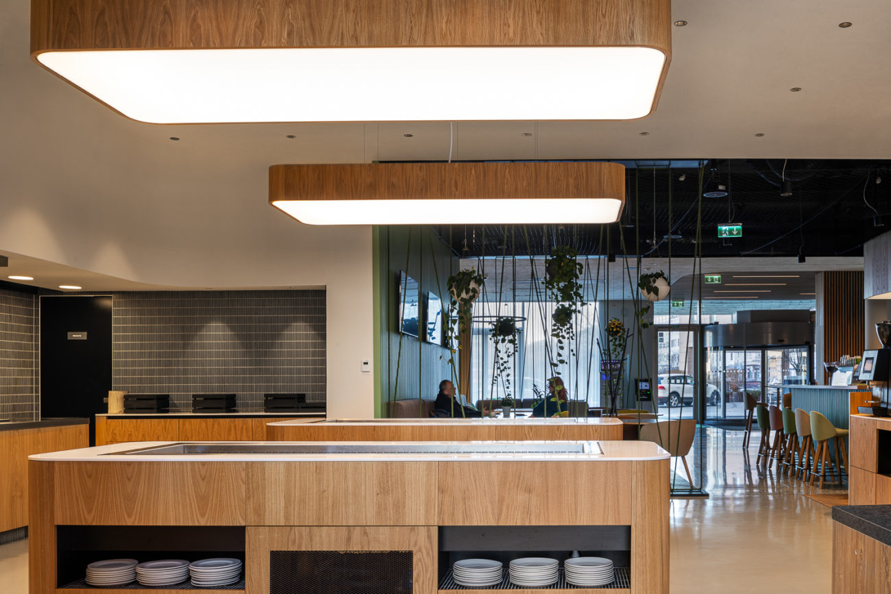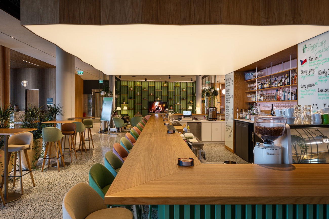 2 zavěšená svítidla z Barrisolu nad pultem a podsvícený podhled z translucentního Barrisolu nad recepcí.