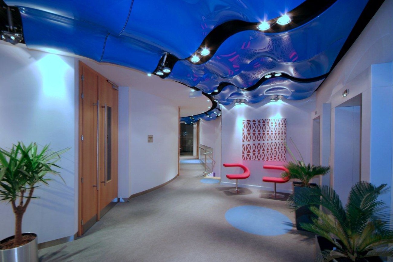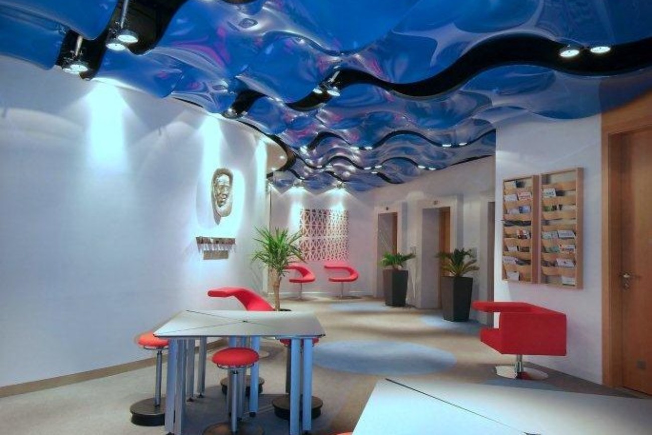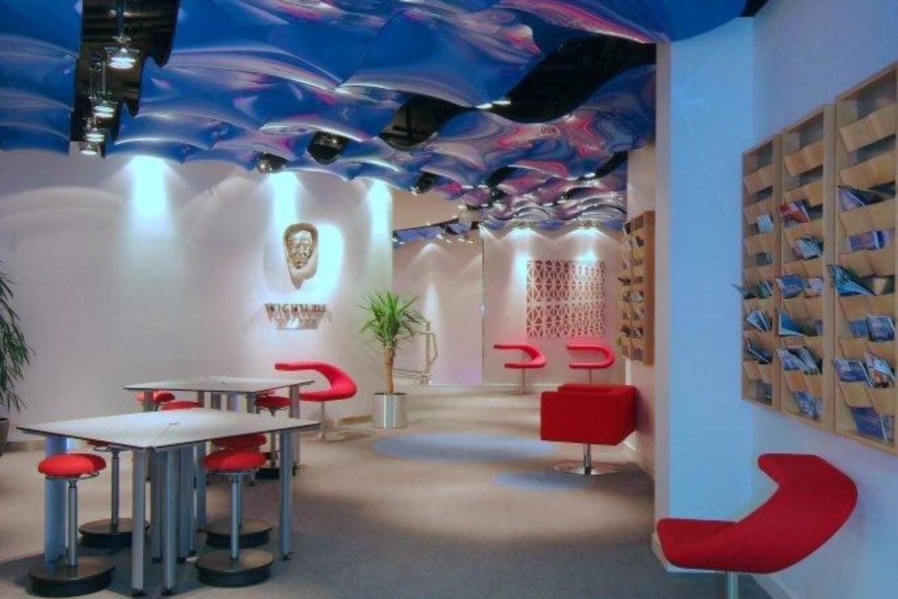 Tvarované lesklé fólie BARRISOL včetně konstrukcí v centrále JOHNSONS & JOHNSONS, Praha