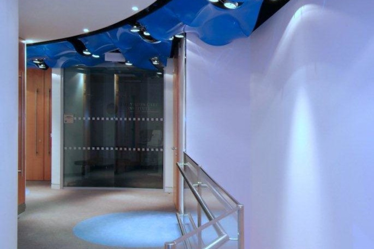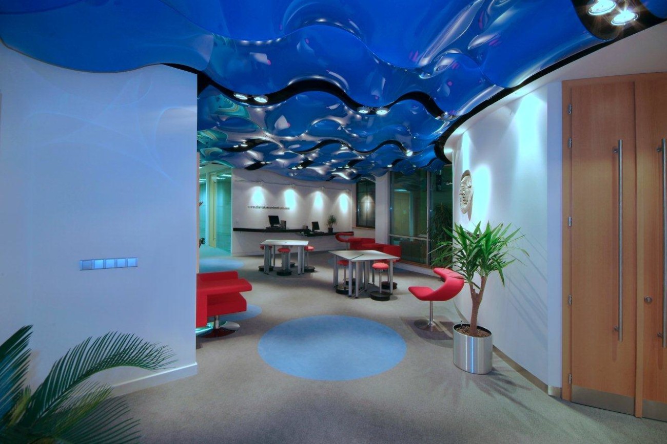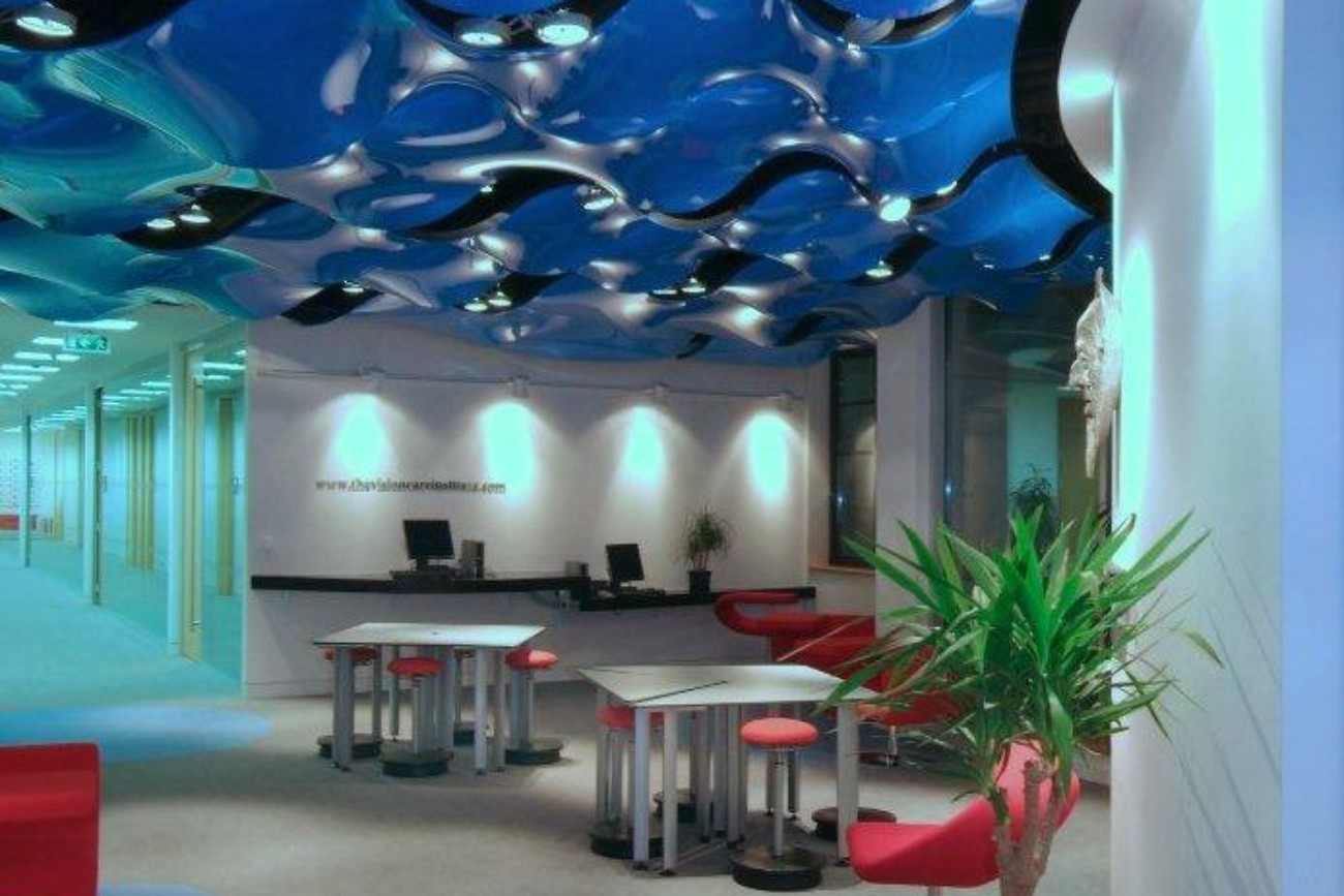 Tvarované lesklé fólie BARRISOL včetně konstrukcí v centrále JOHNSONS & JOHNSONS, Praha