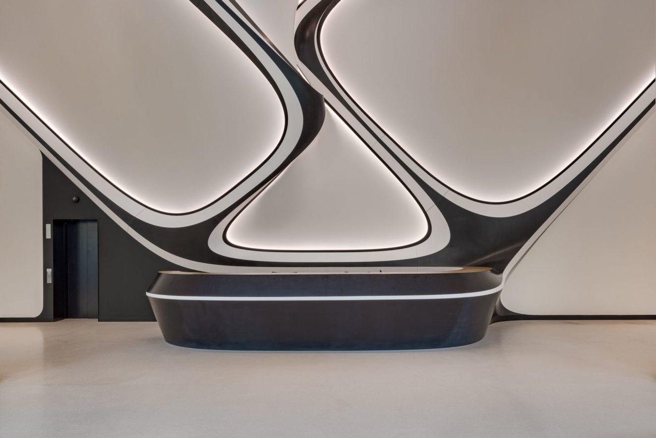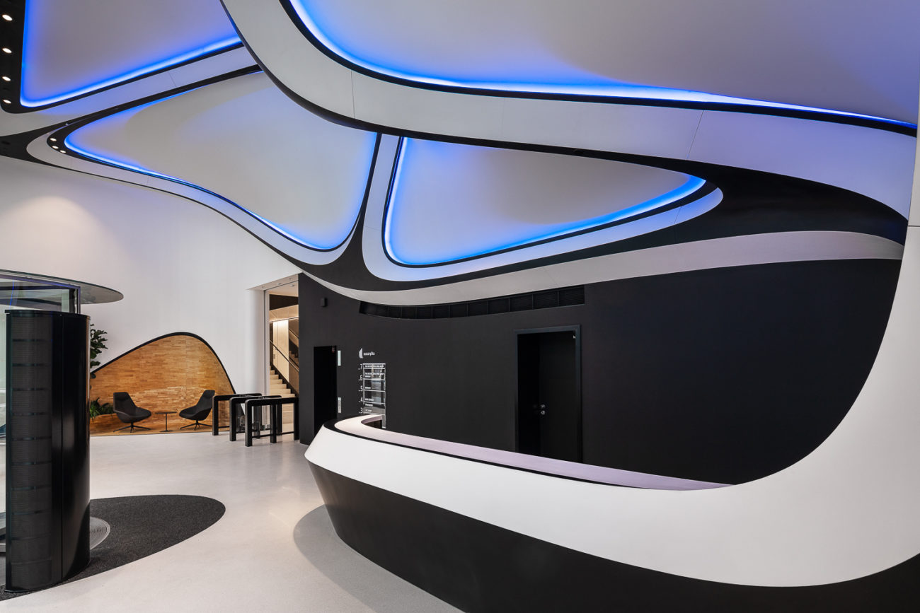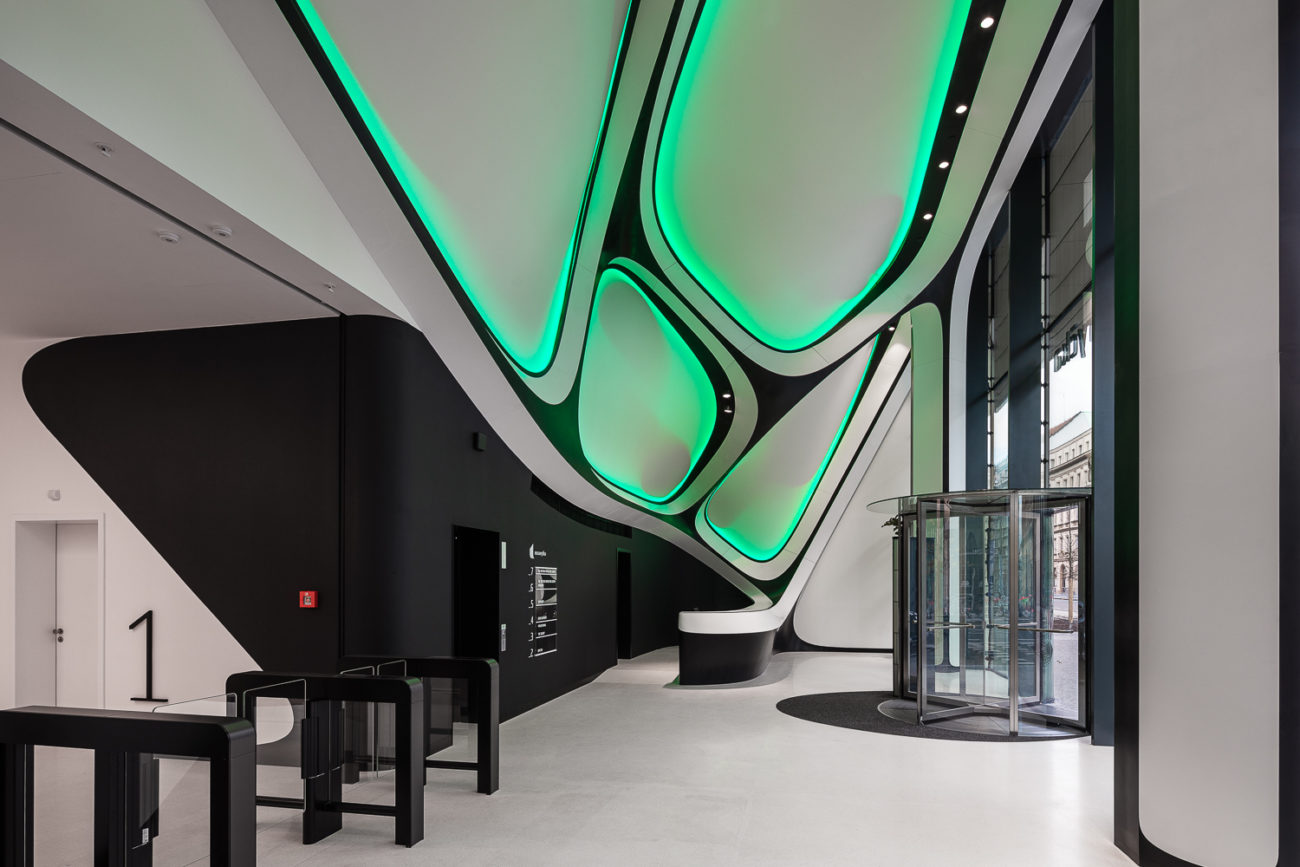 Nasvícený bílý matný Barrisol s 3D tvarováním střihem bez použití konstrukce (stěna, strop) ve vstupním lobby s recepcí - budova A a B.