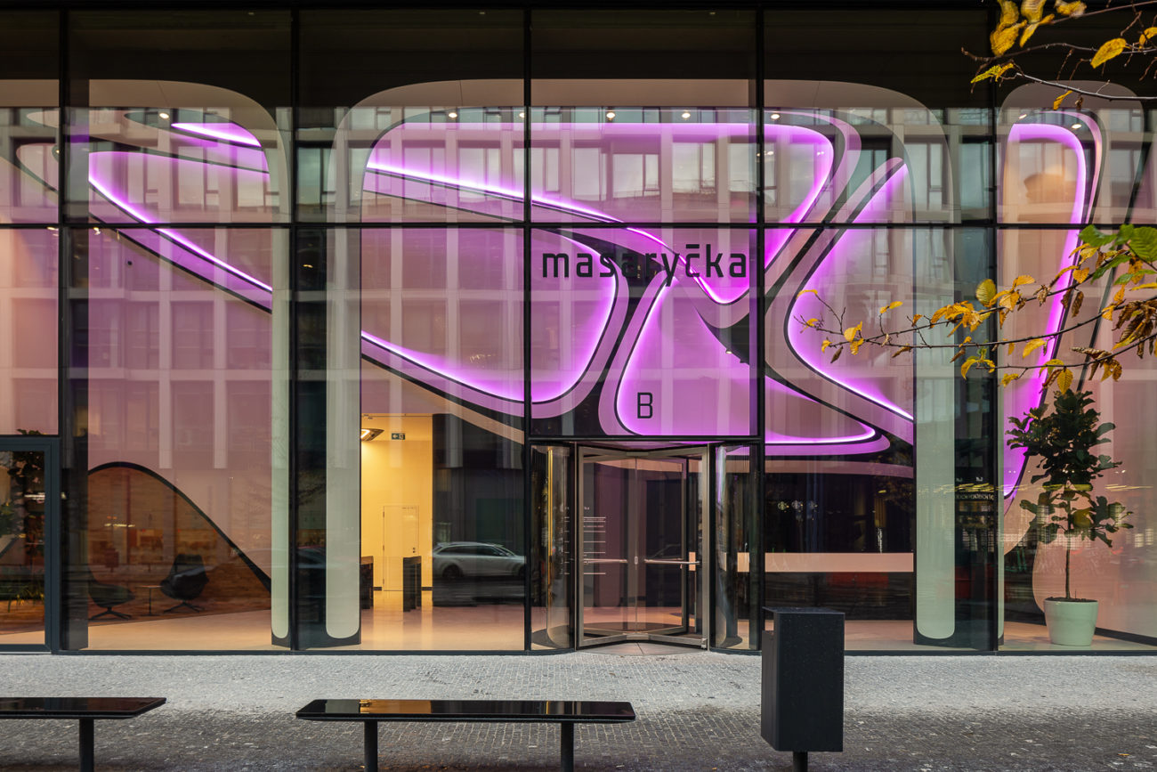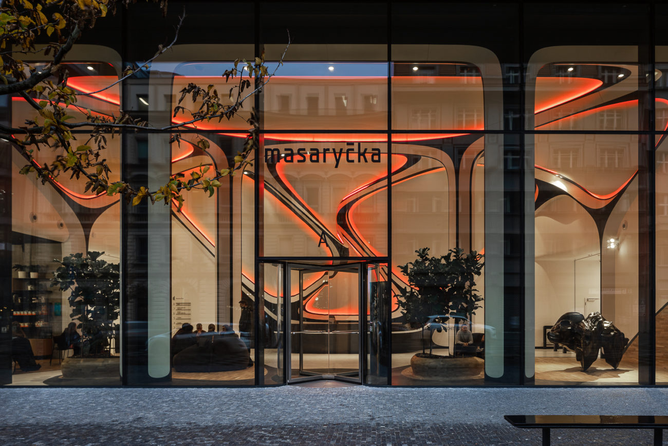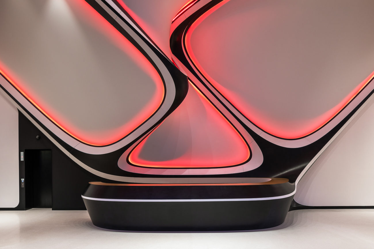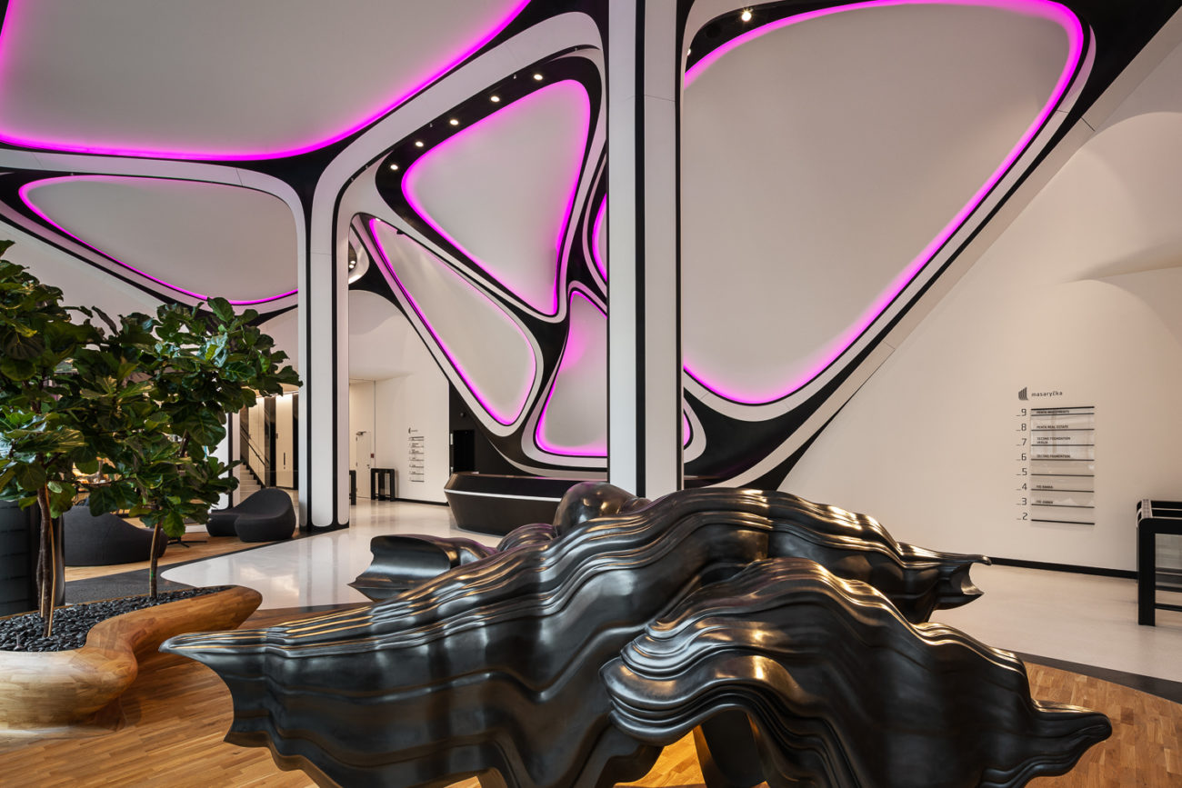 Nasvícený bílý matný Barrisol s 3D tvarováním střihem bez použití konstrukce (stěna, strop) ve vstupním lobby s recepcí - budova A a B.