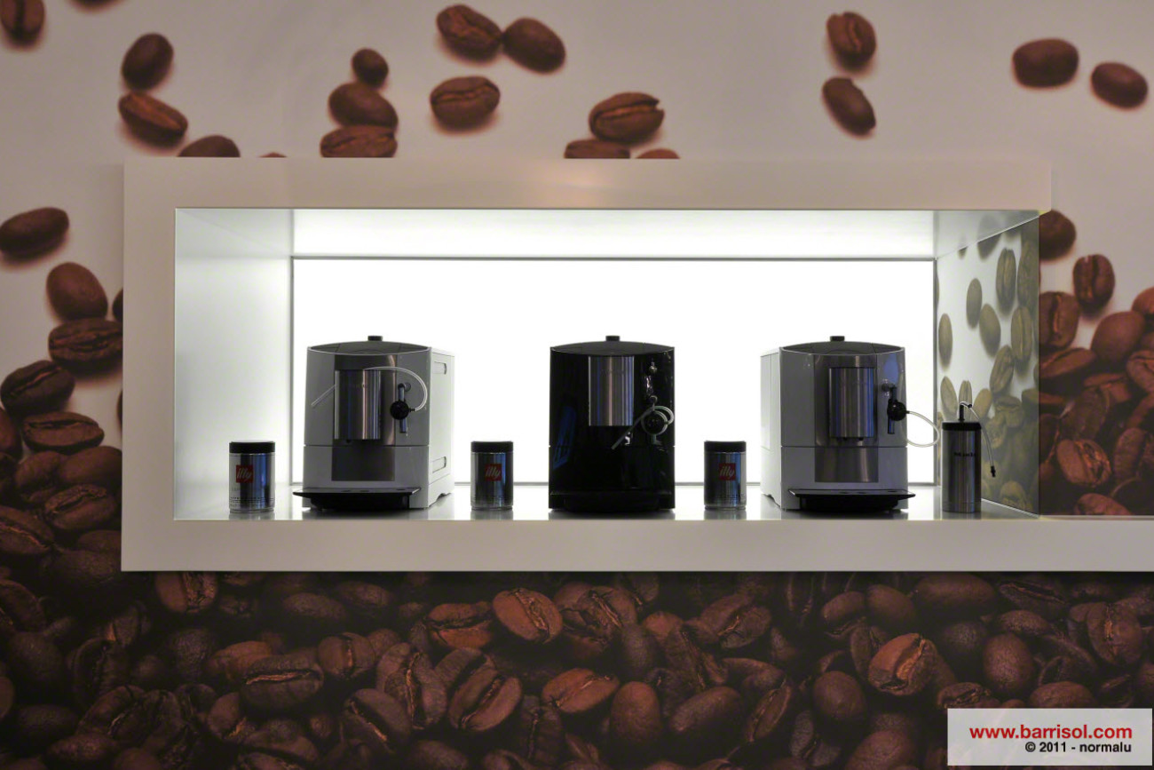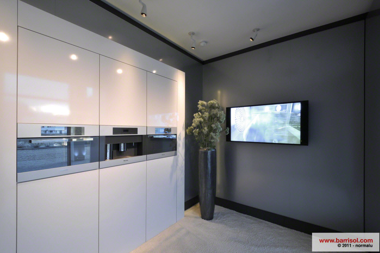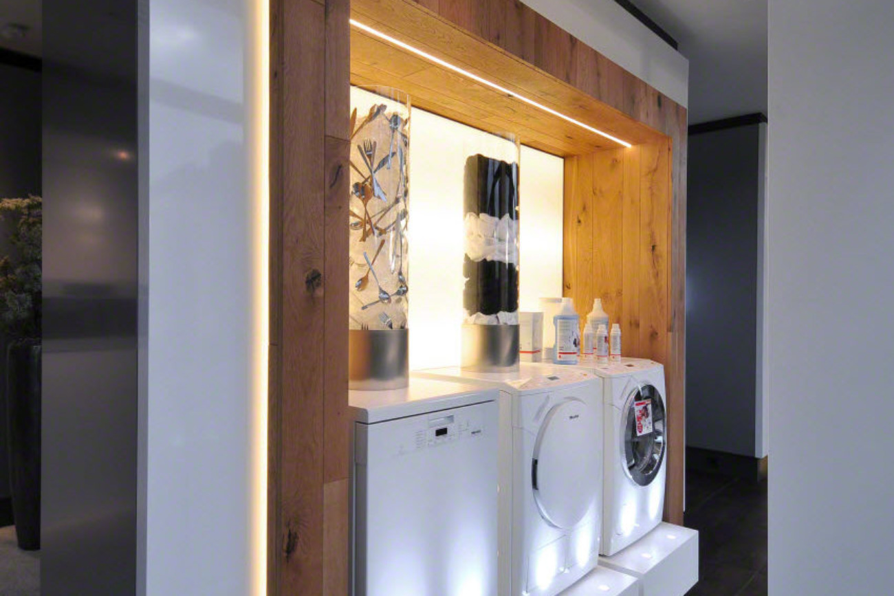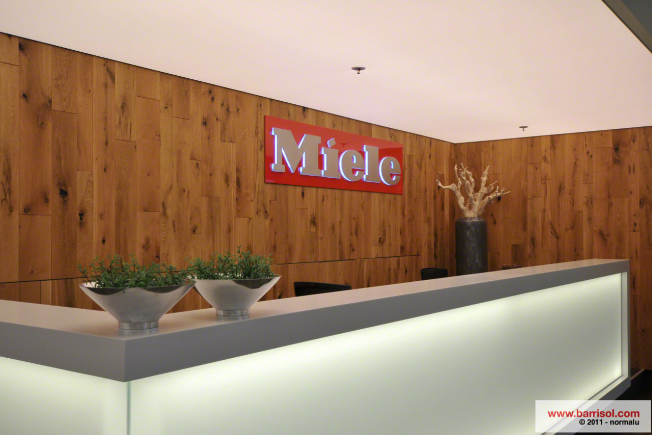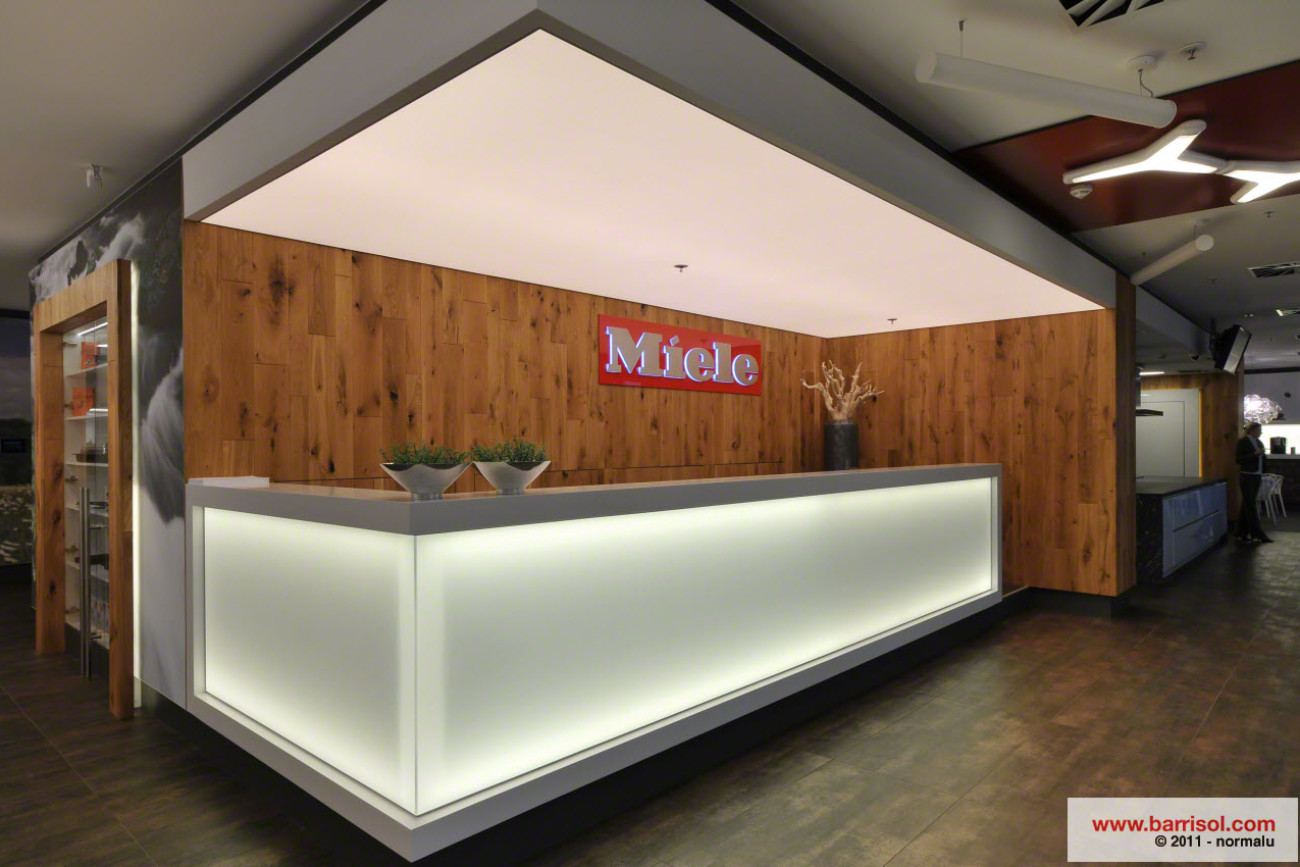 Realizace dekorativních předstěn v celém prostoru showroomu MIELE Brno, průsvitné, lesklé, potištěné, metalické plochy