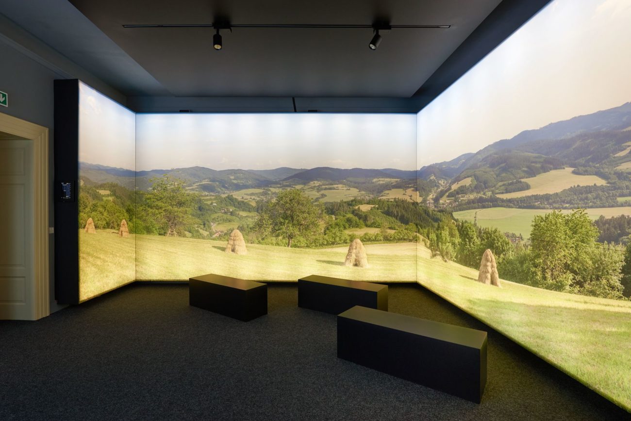Translucentní podsvícený Barrisol na stěnách s tématickým potiskem Valašské přírody, stěna z Barrisolu mirror.