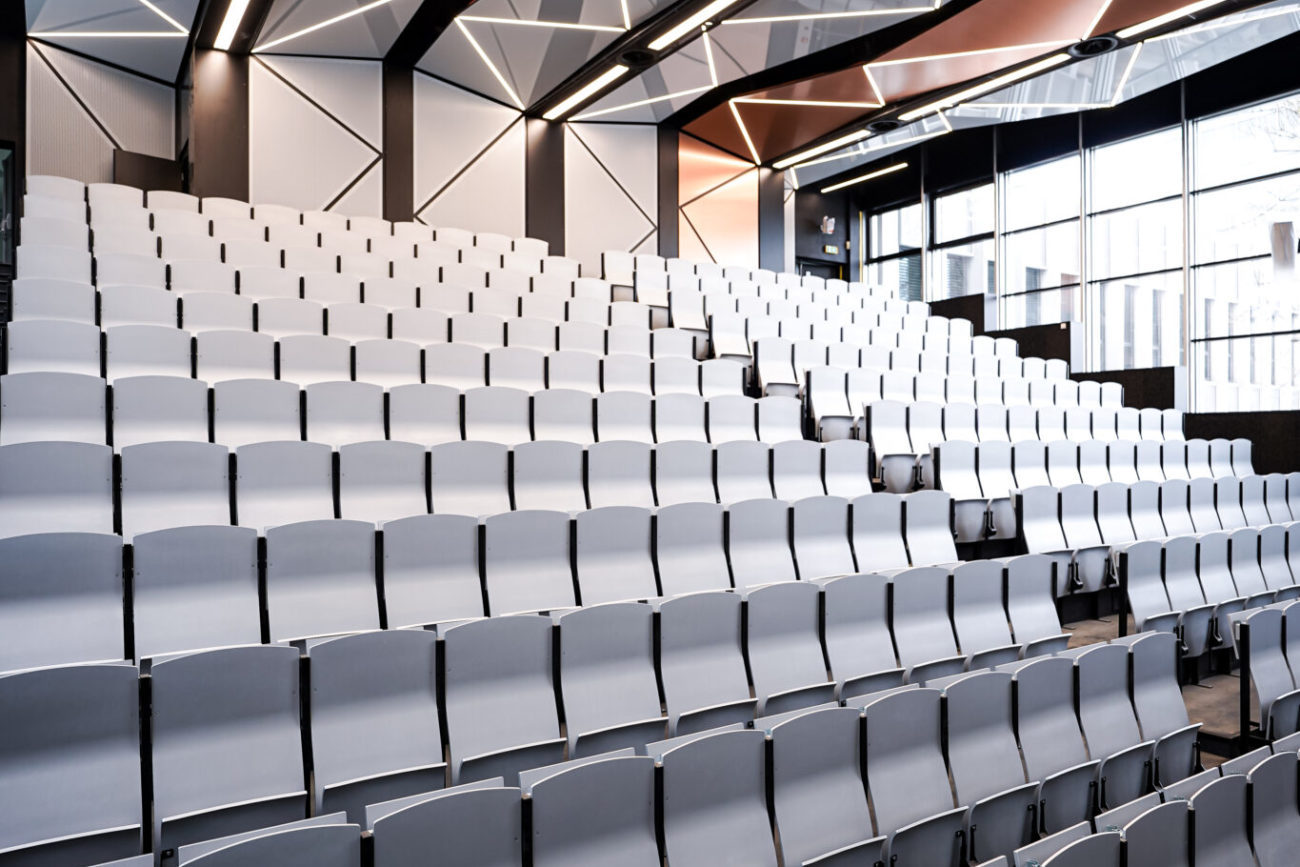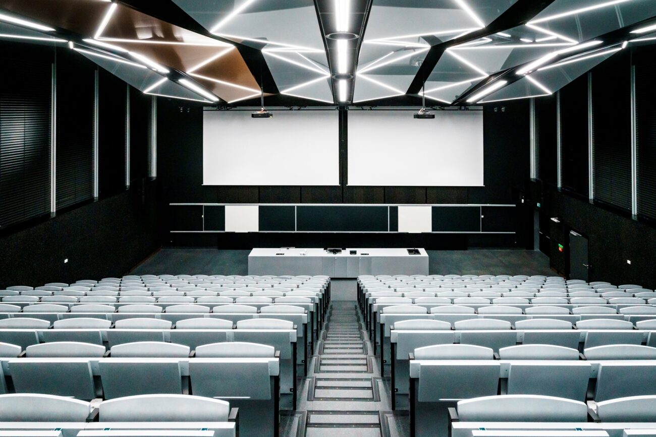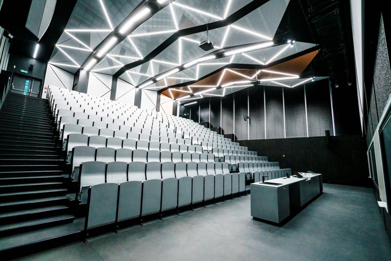 Podhledy z hliníkových rámů potažených systémem Barrisol s mikroperforací v lesklém designu v nových posluchárnách ČVUT