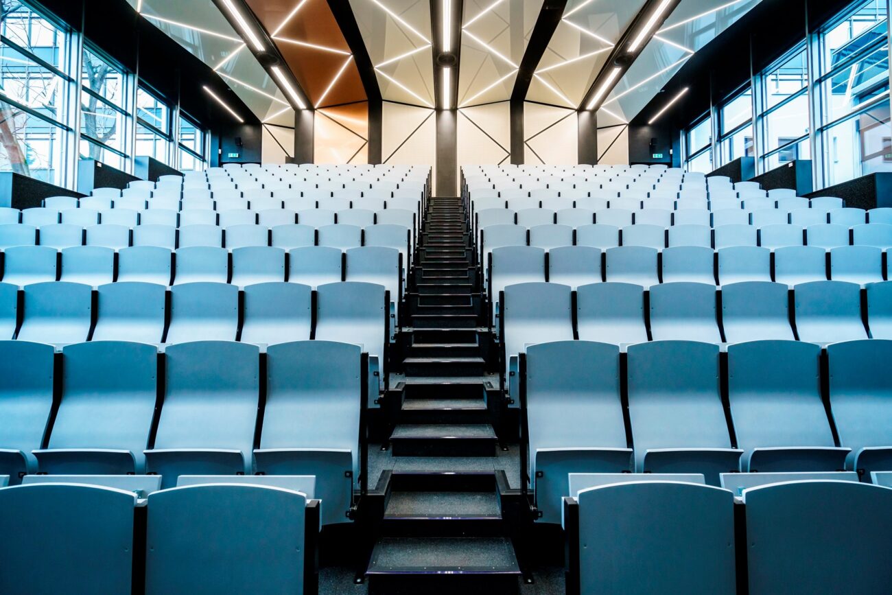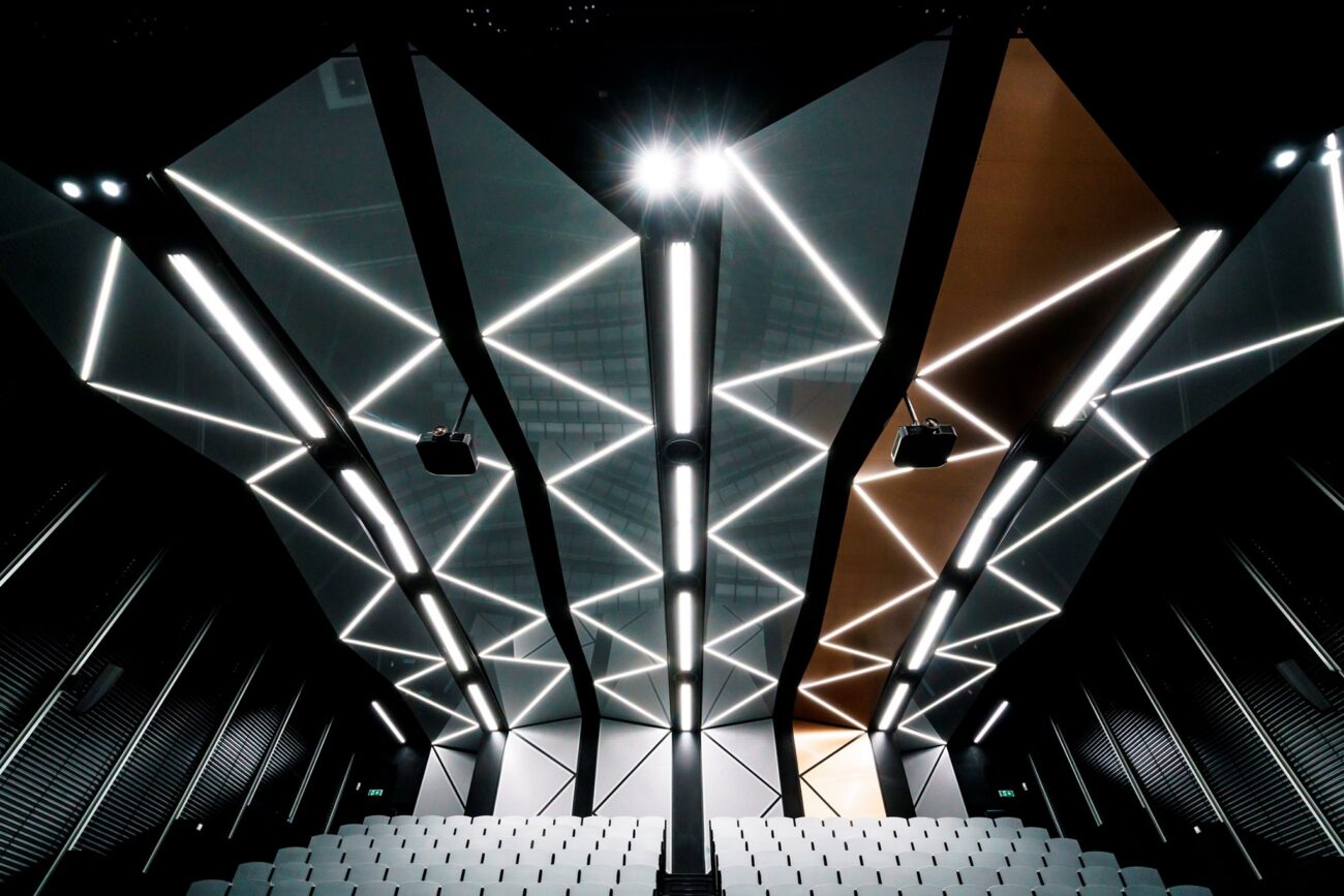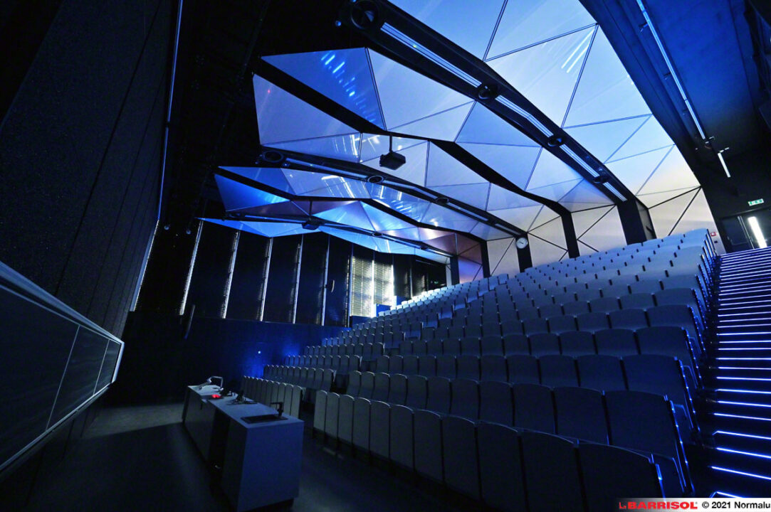 Podhledy z hliníkových rámů potažených systémem Barrisol s mikroperforací v lesklém designu v nových posluchárnách ČVUT