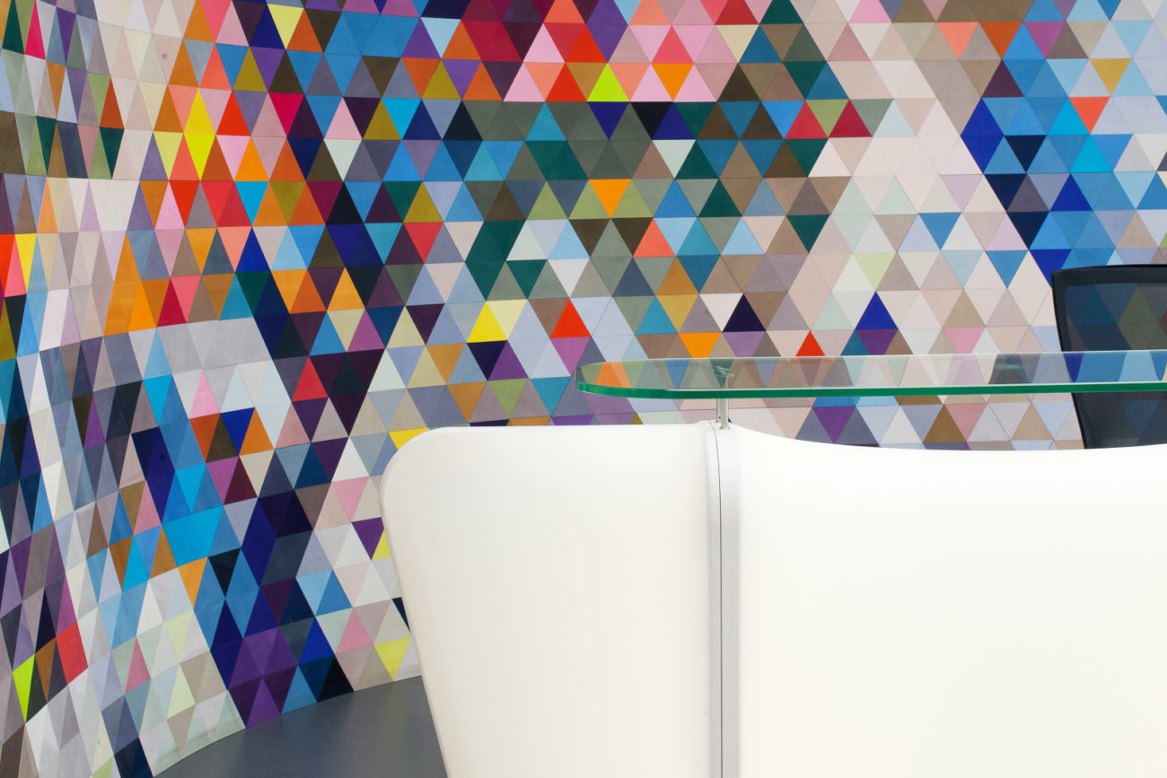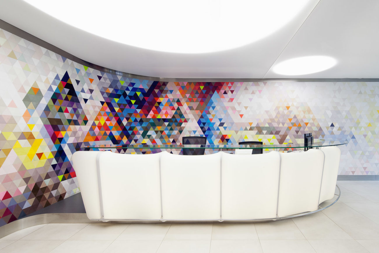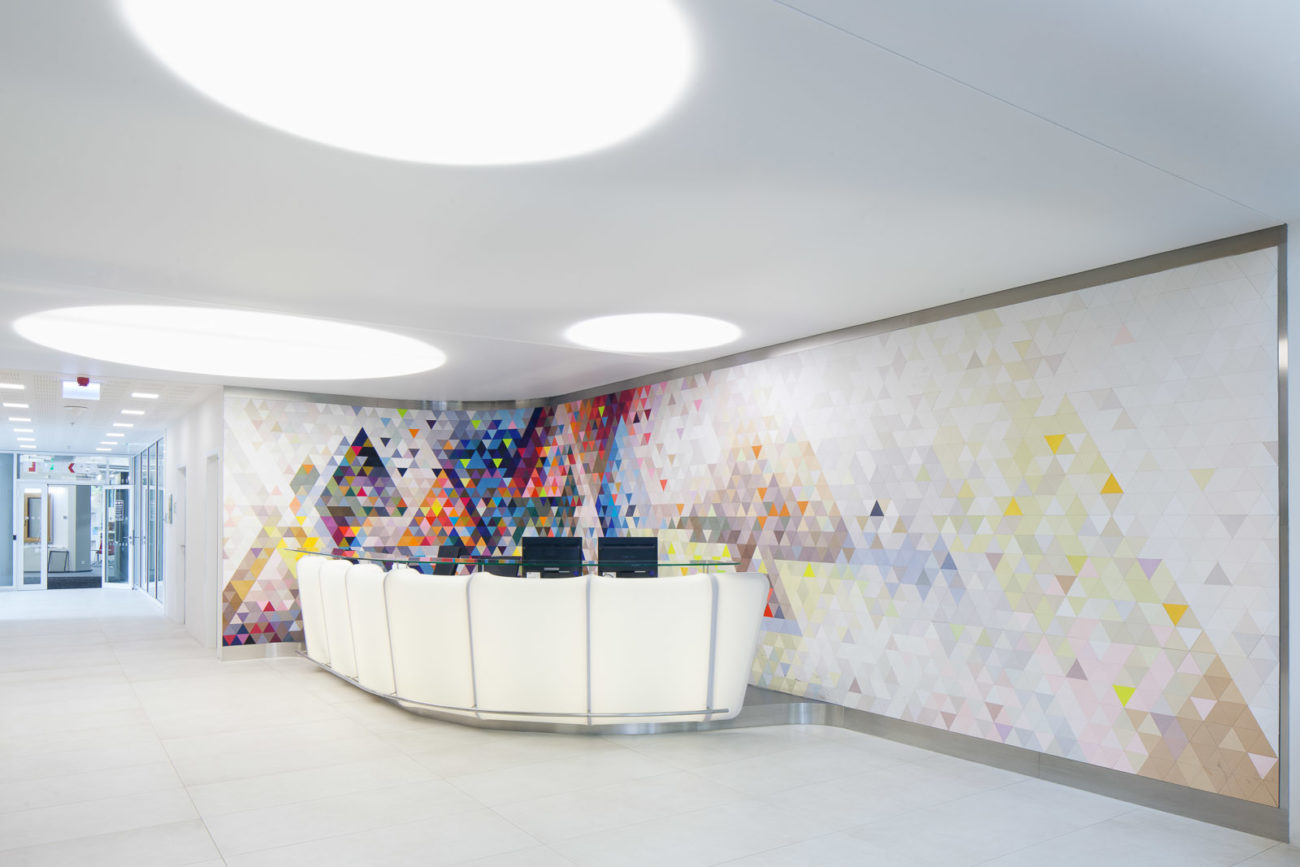 Světelný podhled a plášť recepčního pultu v recepci RIWER WIEW, Praha 5