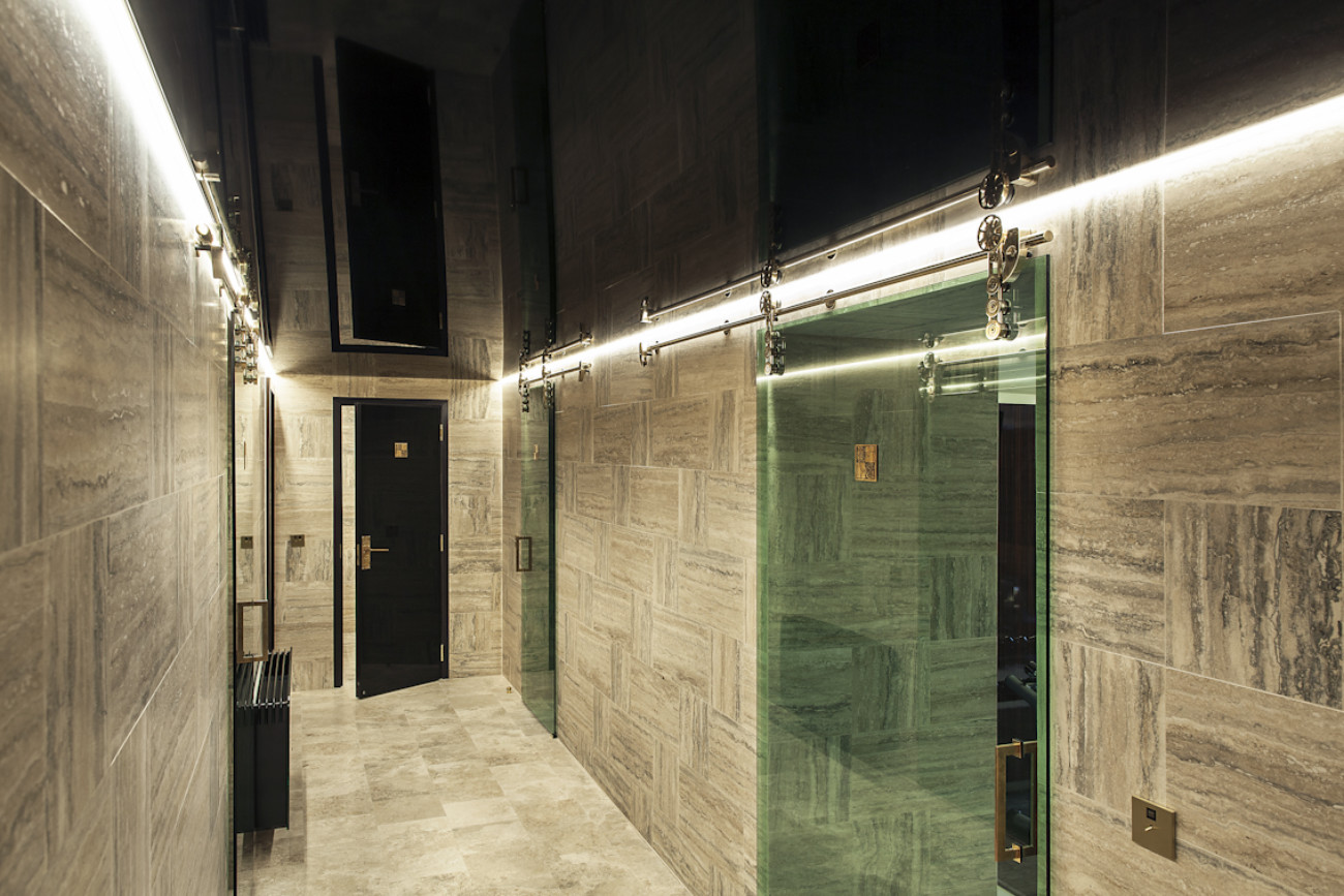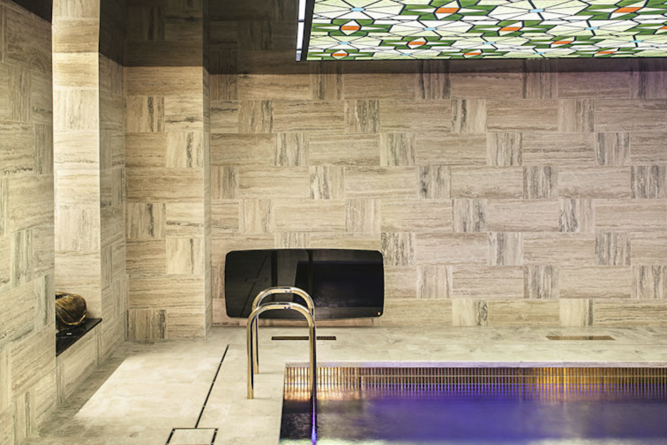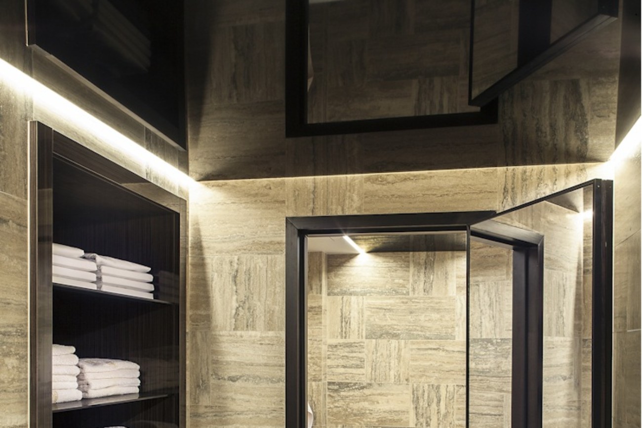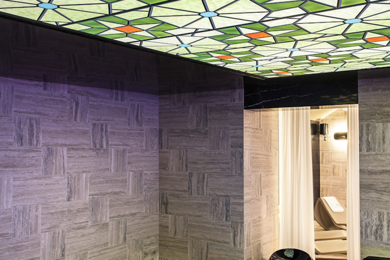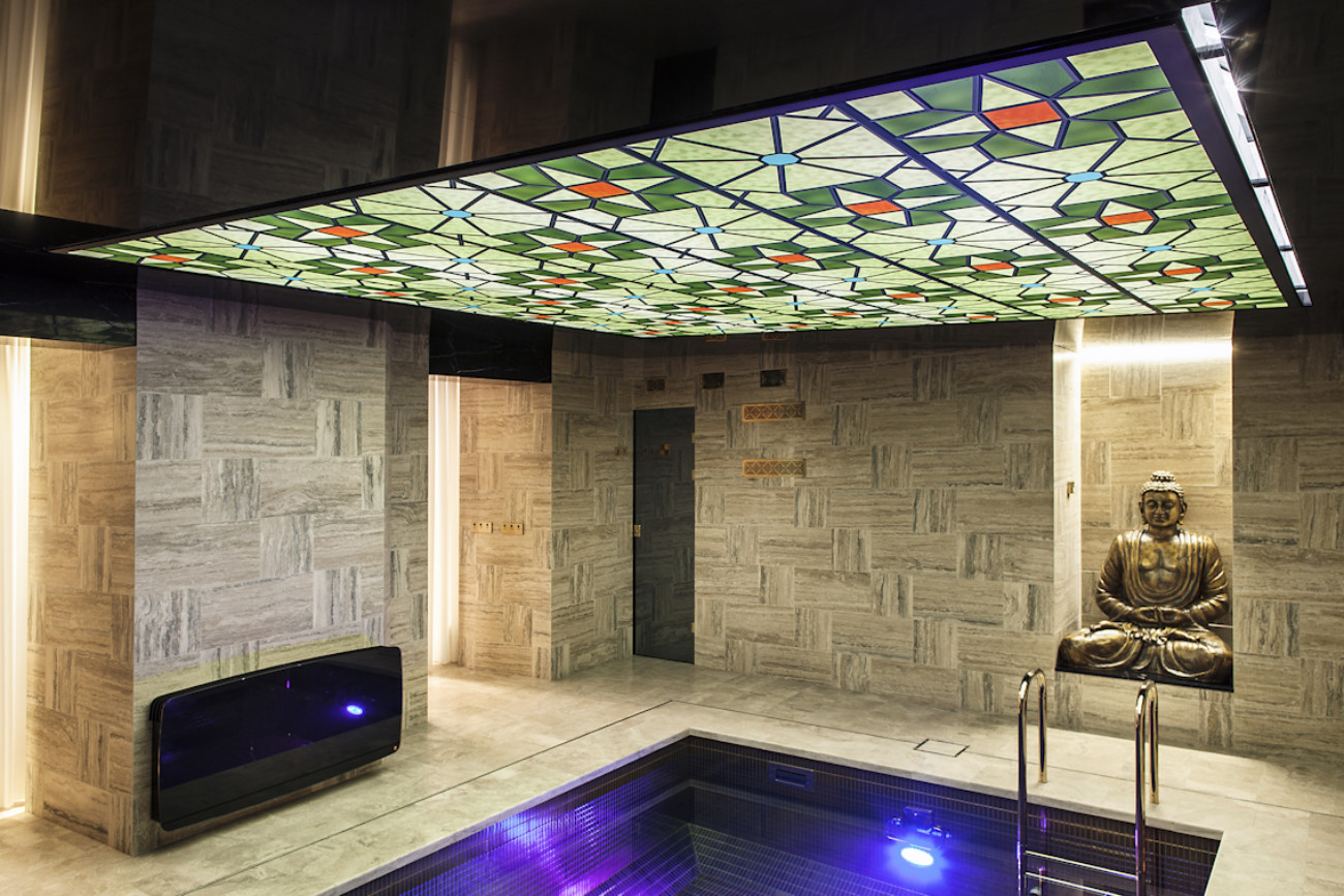 Realizace lesklé černé fólie s liniovým obvodovým svícením a potištěné fólie s motivem vitráže nad plochou bazénu, Praha