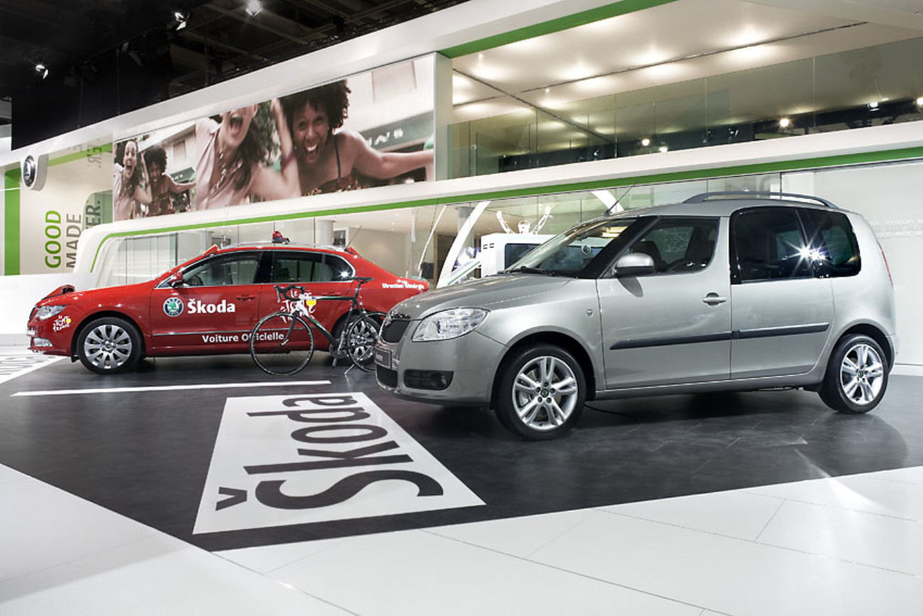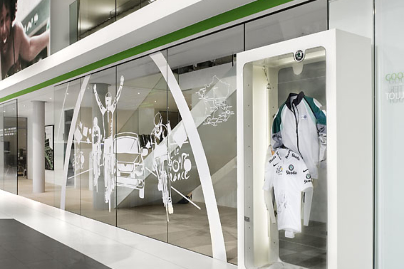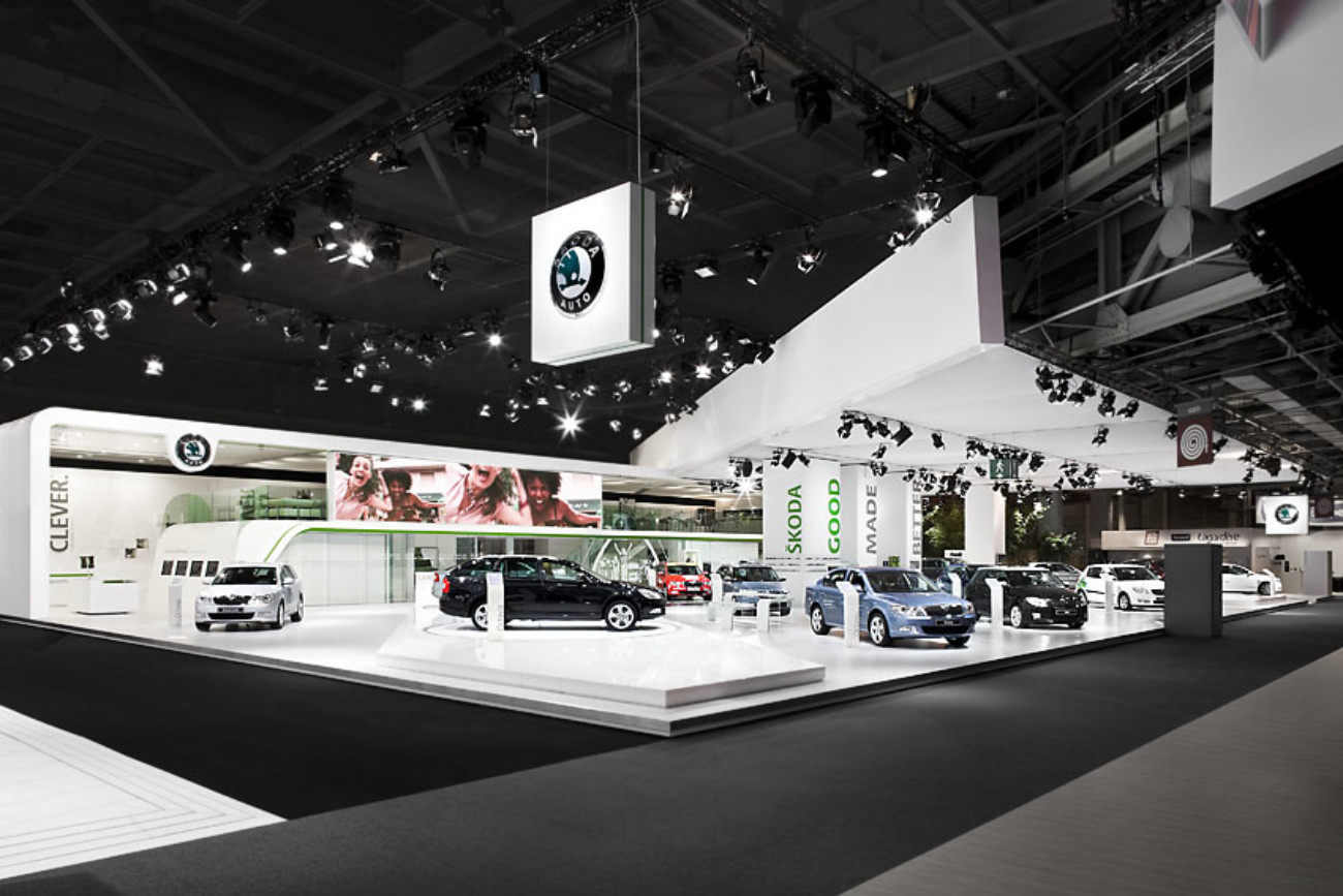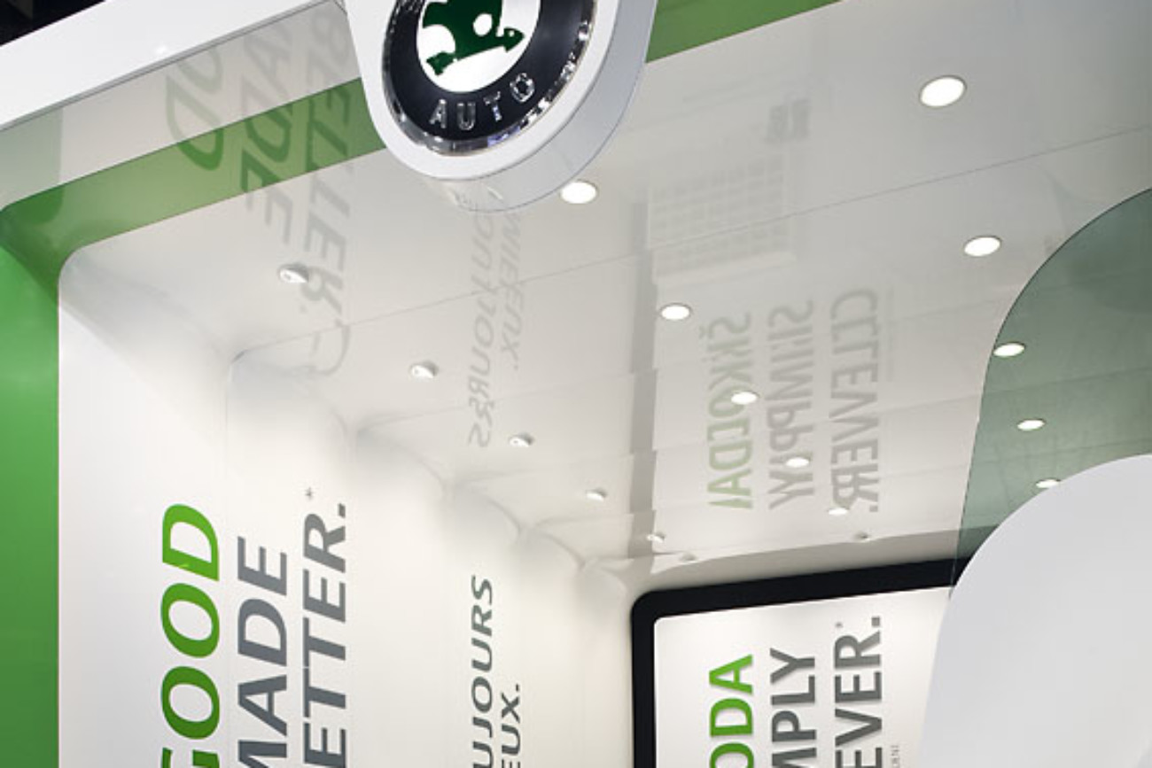 Potažení stěny a střechy stánku ŠKODA AUTO lesklou fólií BARRISOL, kombinace bílé a zelené lesklé fólie, Paříž