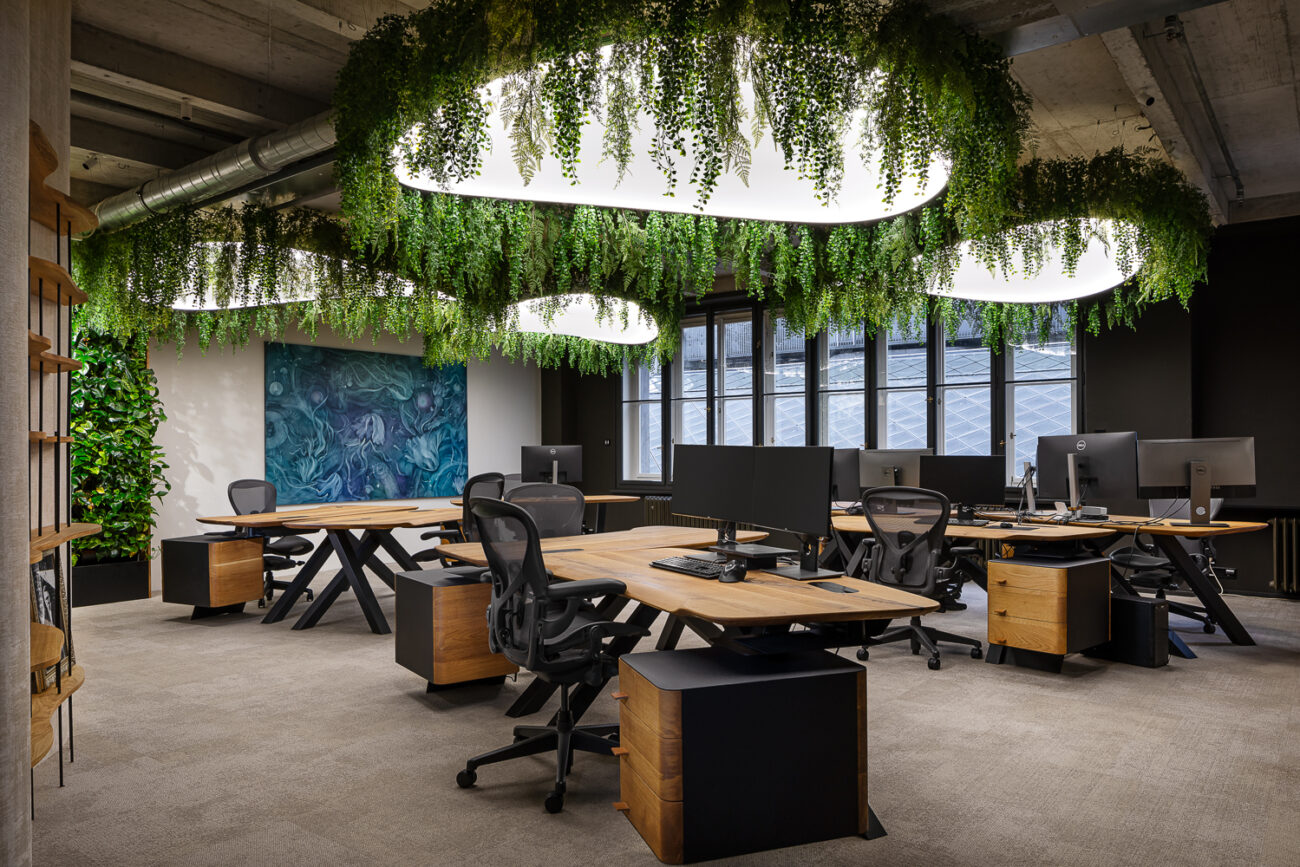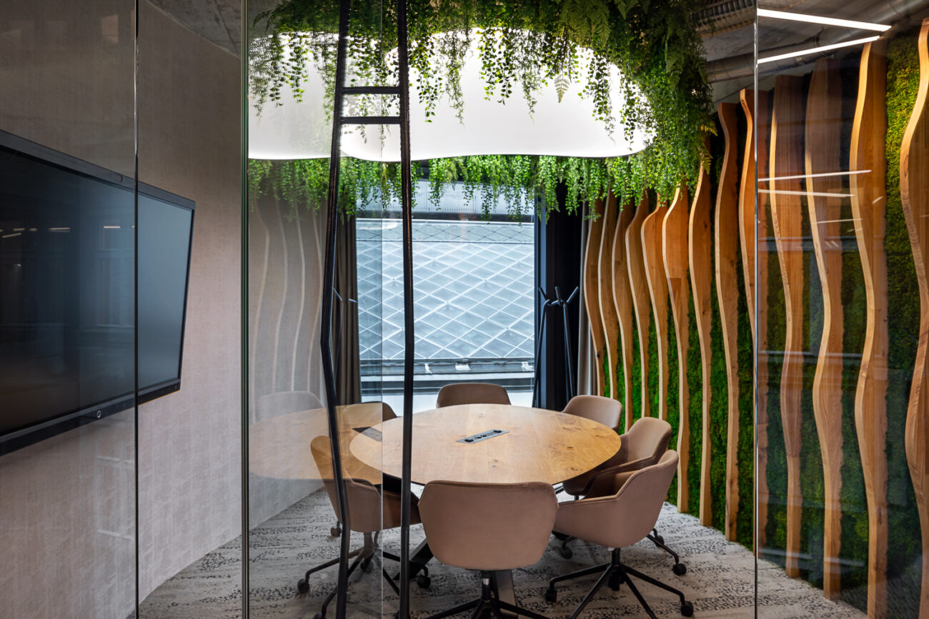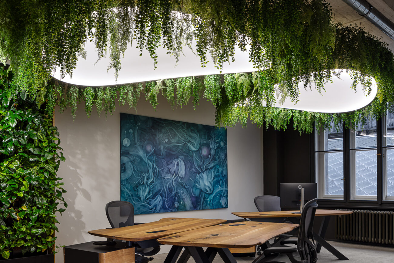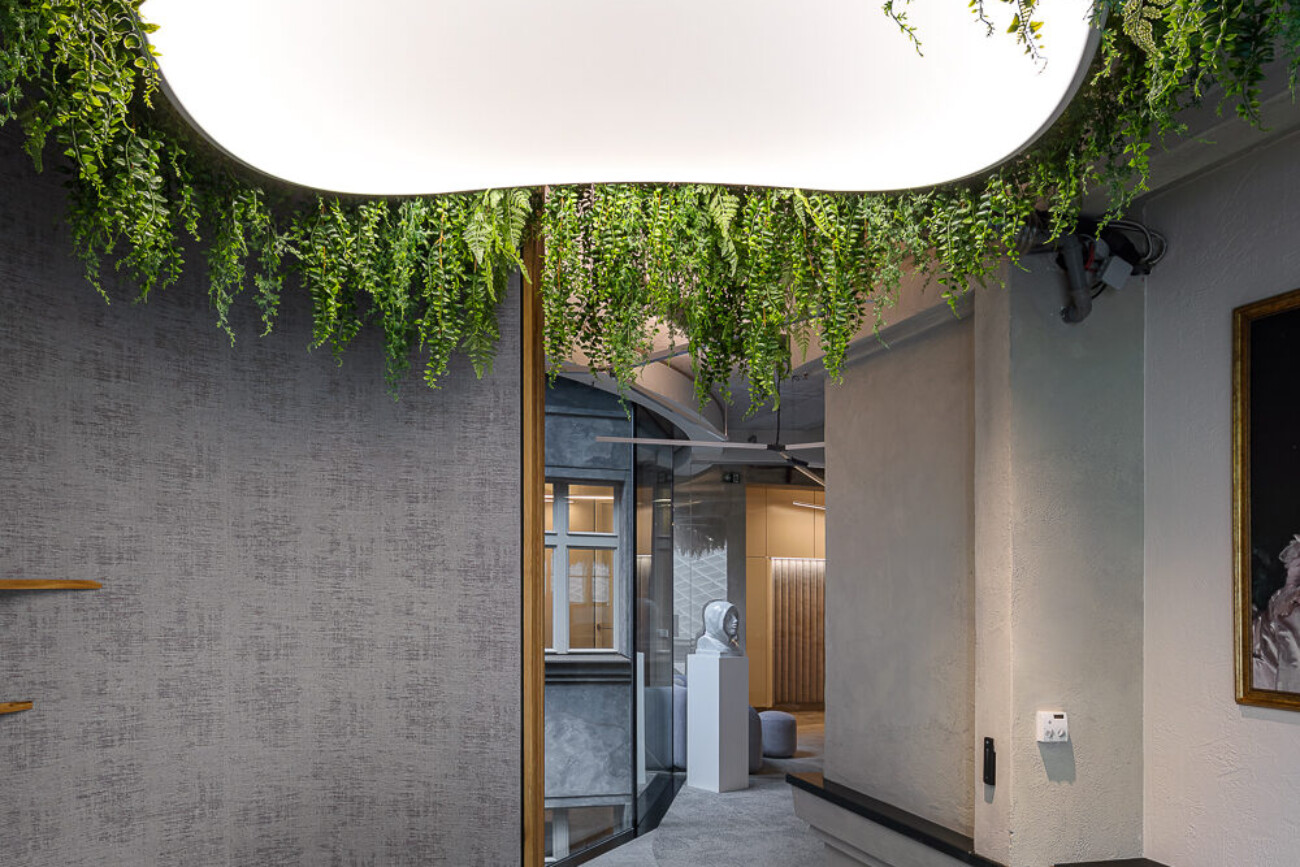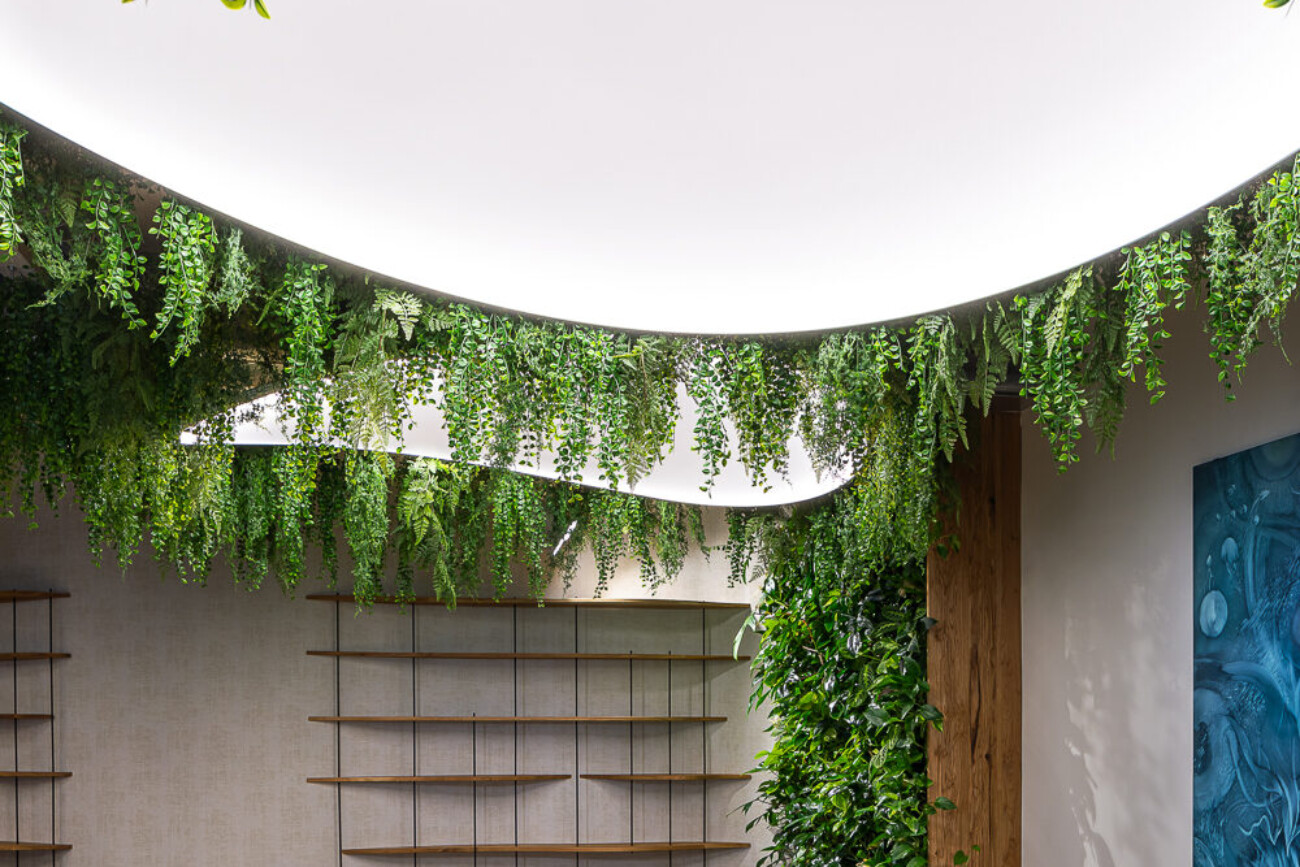 Závěsná atypická svítidla ve tvaru listu vyrobená ze speciálního kulatého Barrisol profilu se zámkem pro 2 fólie. Spodní část svítidla je z translucentní fólie, horní část je z matné bílé fólie s akustickou nanoperforací.