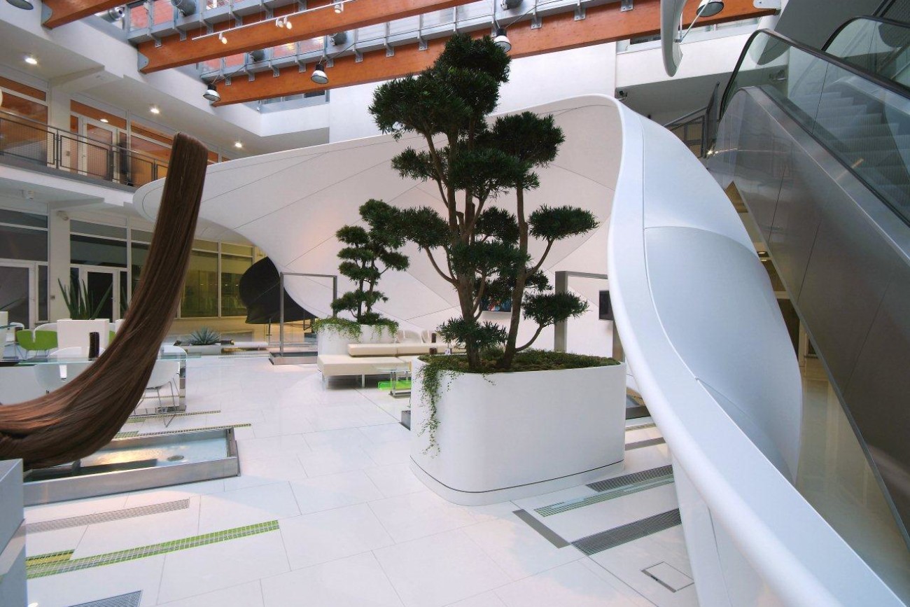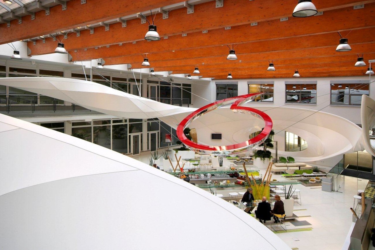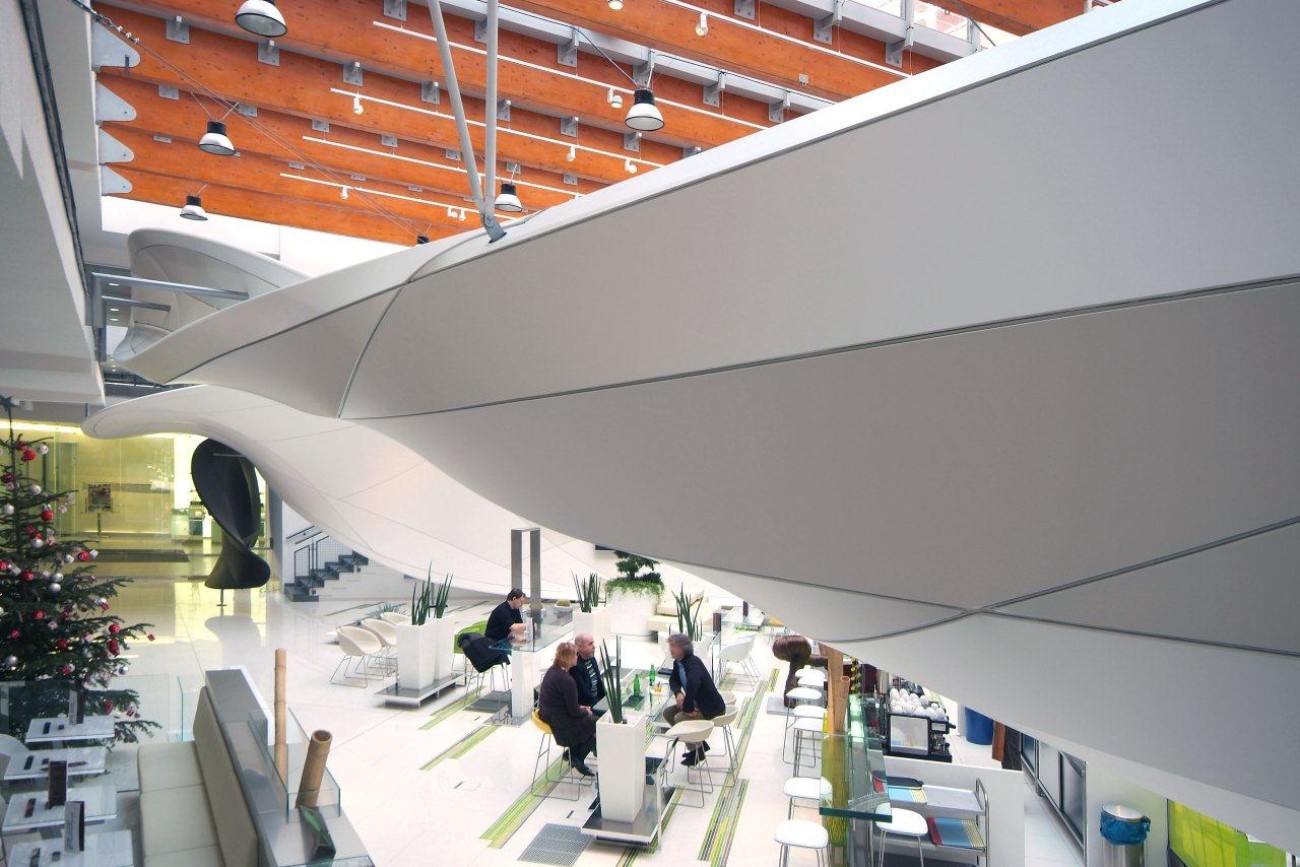 Výroba a montáž 3D tvarovaných prvků v atriu společnosti VODAFONE, konstrukce včetně bílé lesklé fólie, Praha