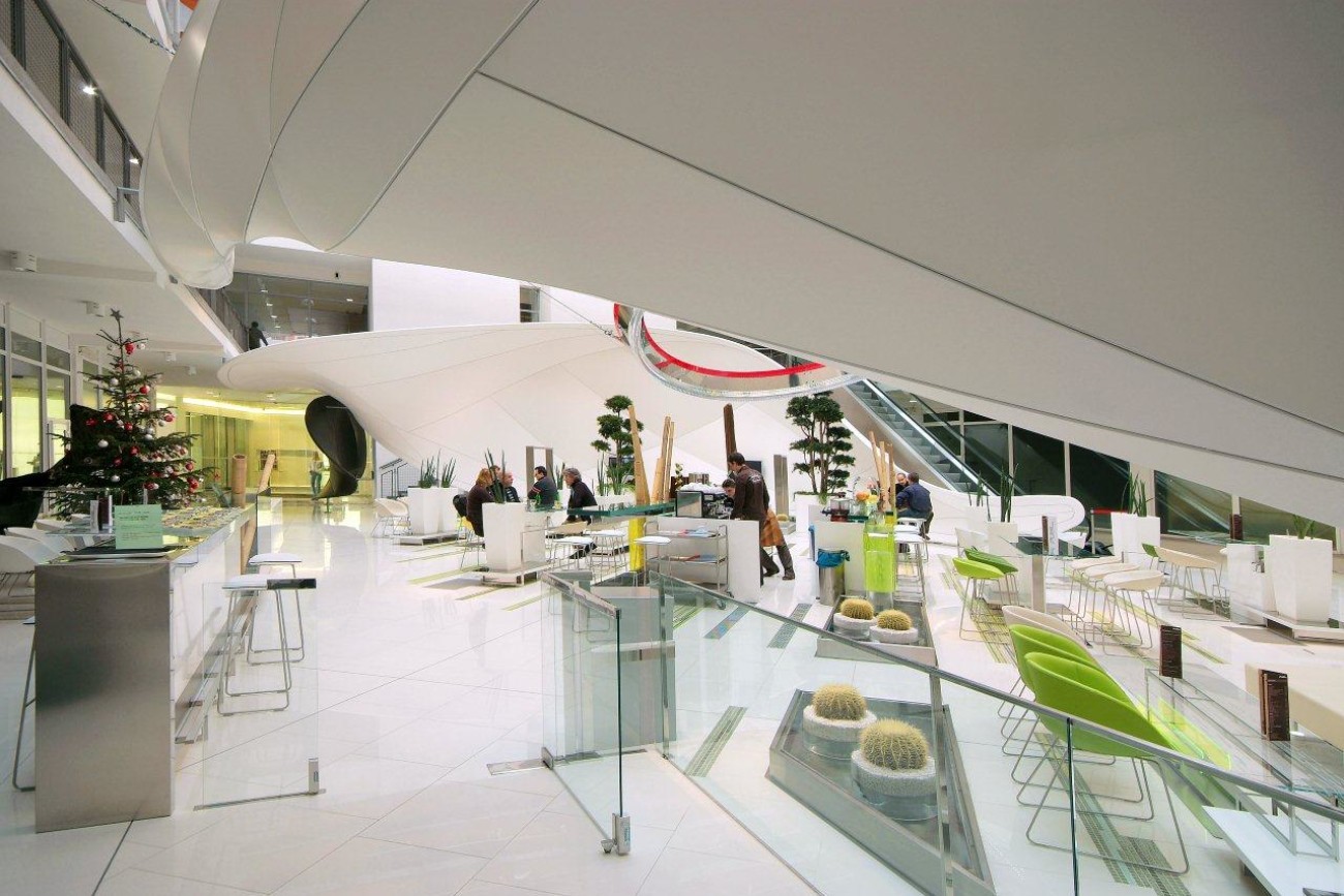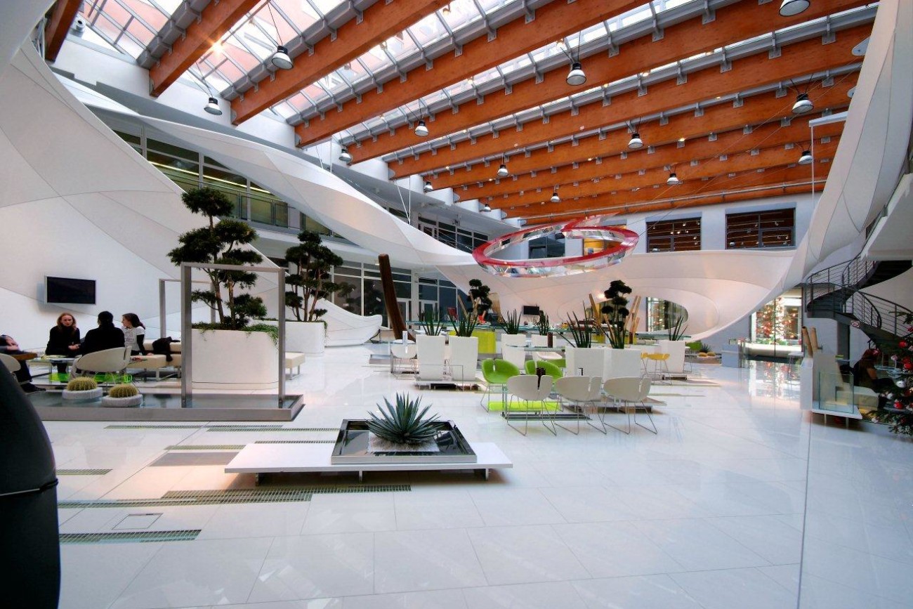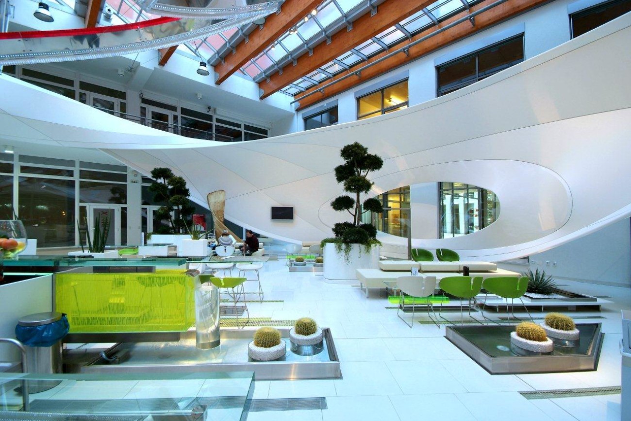 Výroba a montáž 3D tvarovaných prvků v atriu společnosti VODAFONE, konstrukce včetně bílé lesklé fólie, Praha