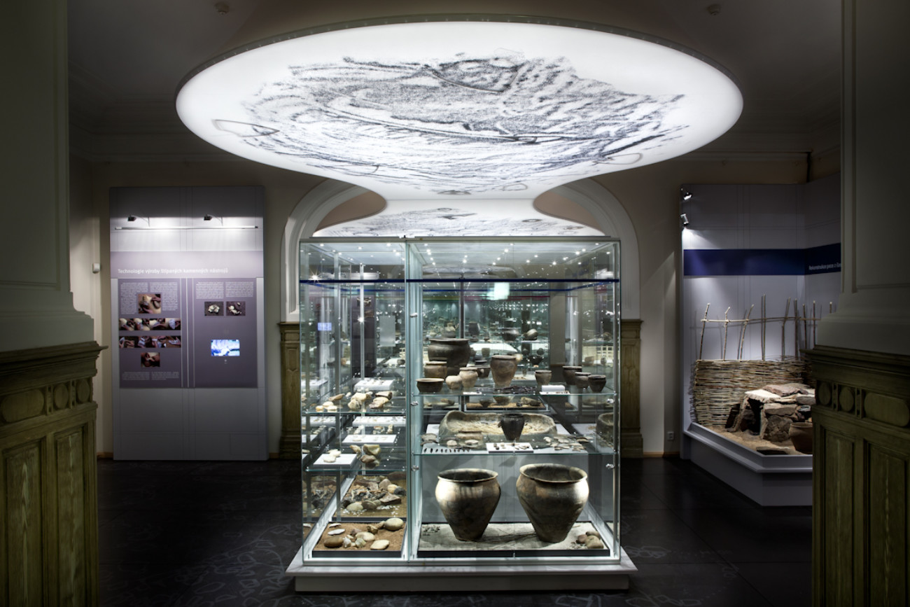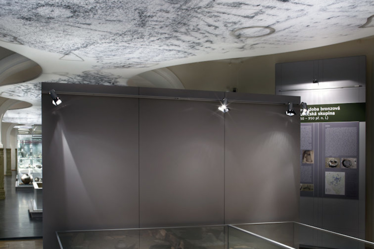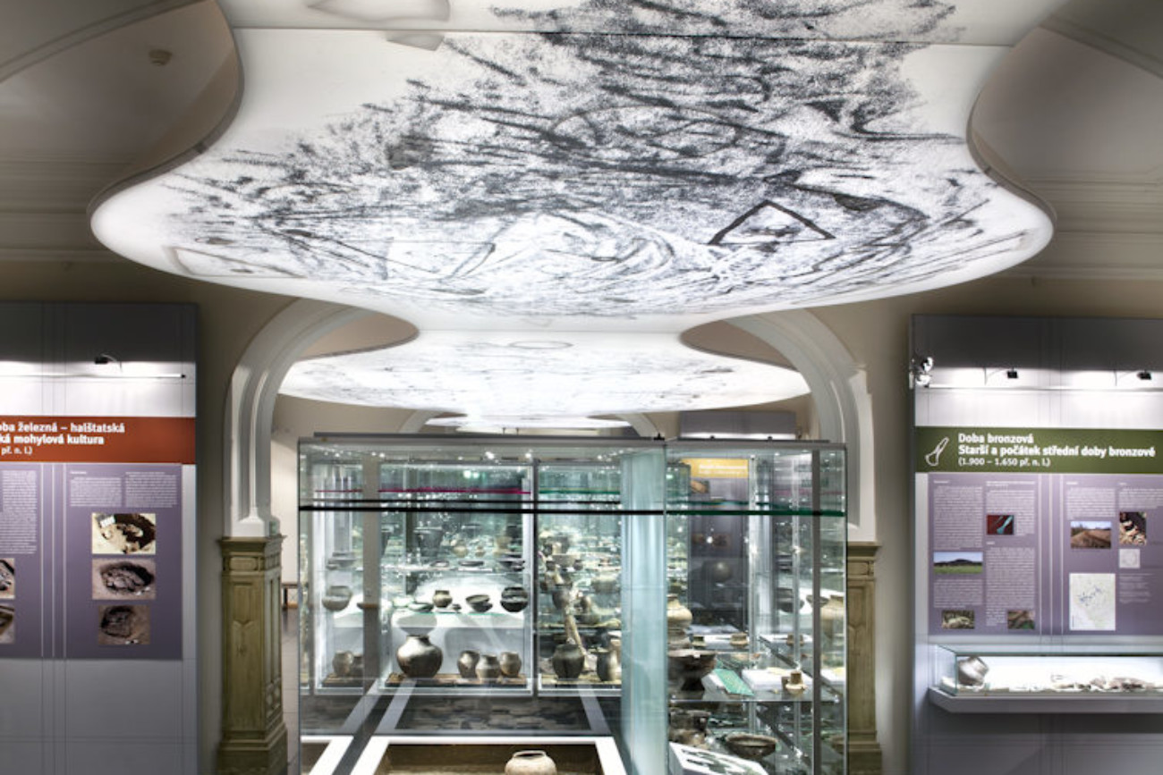 Realizace světelného potištěného objektu spojující celou expozici, včetně nosné konstrukce, Plzeň
