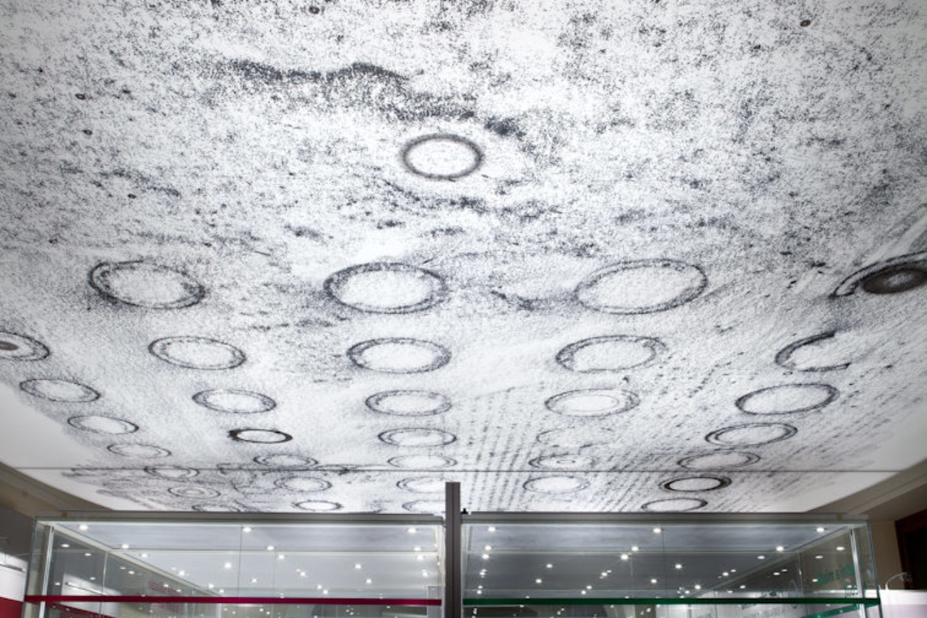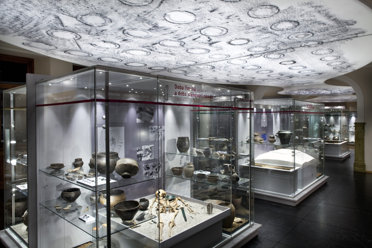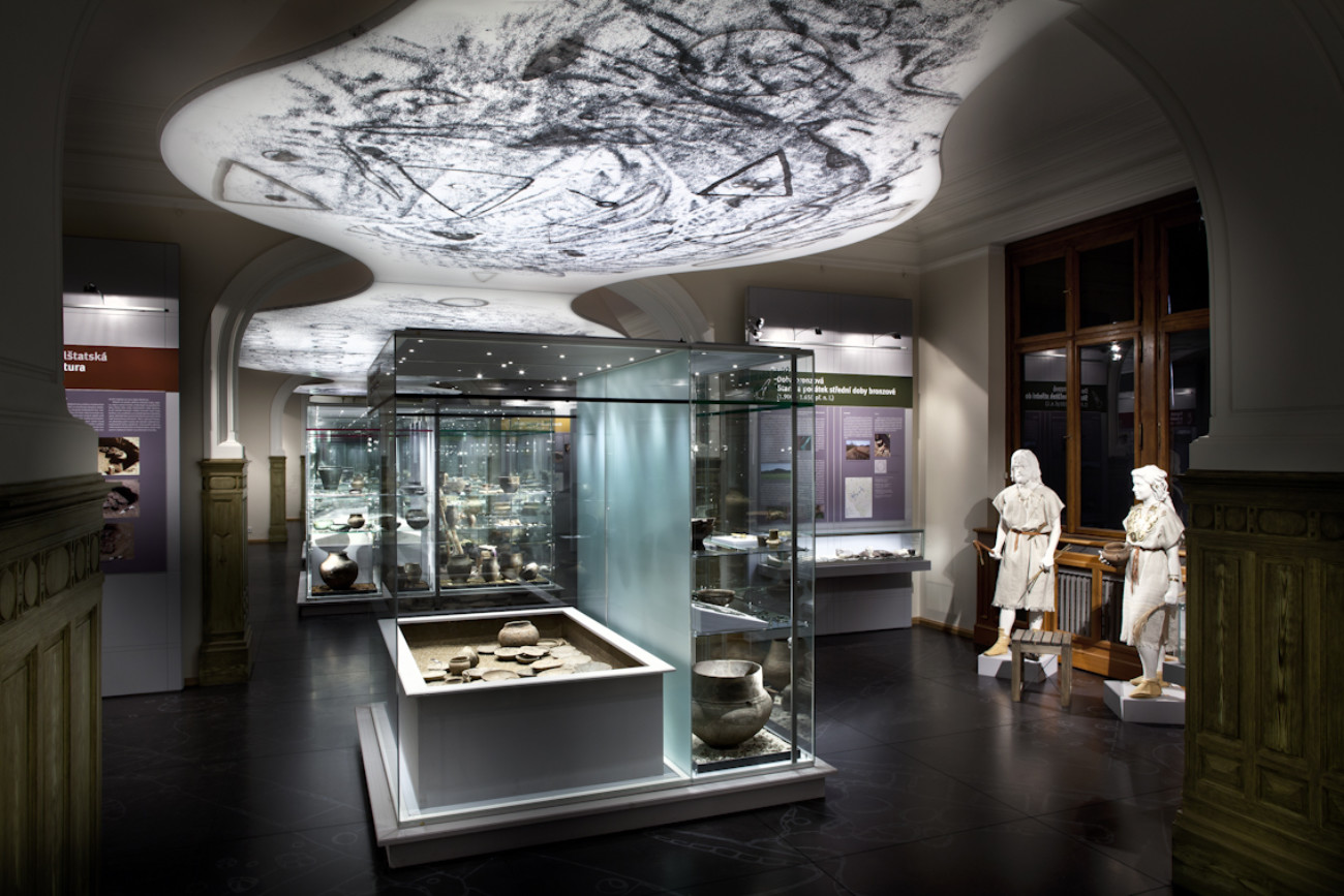 Realizace světelného potištěného objektu spojující celou expozici, včetně nosné konstrukce, Plzeň
