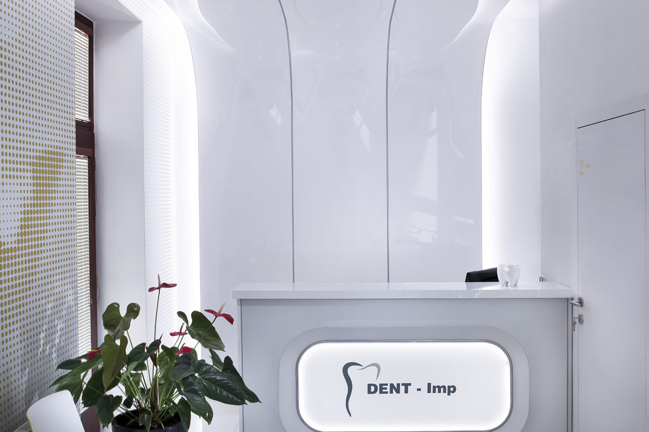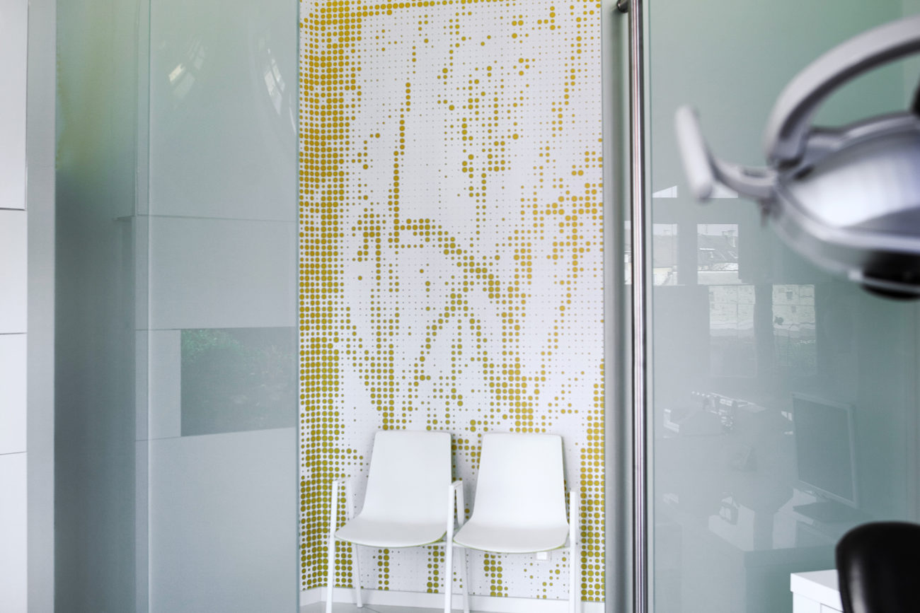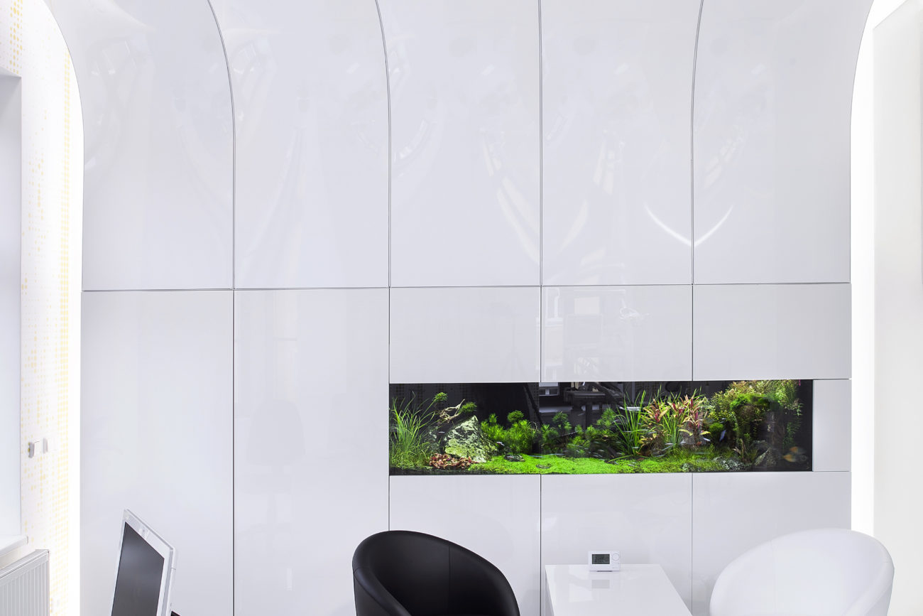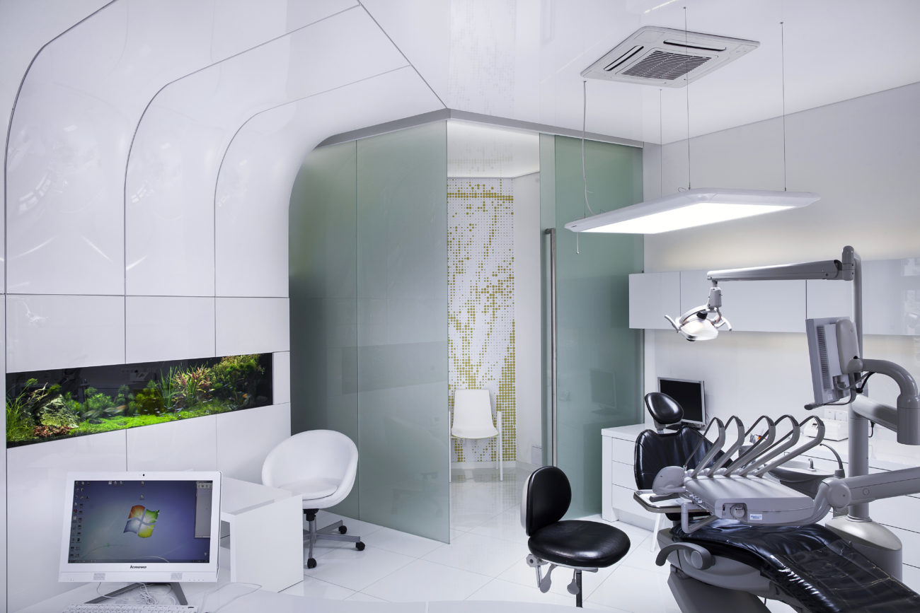 Stěny a podhledy z bílé lesklé fólie v zubní ordinaci, Uherské Hradiště